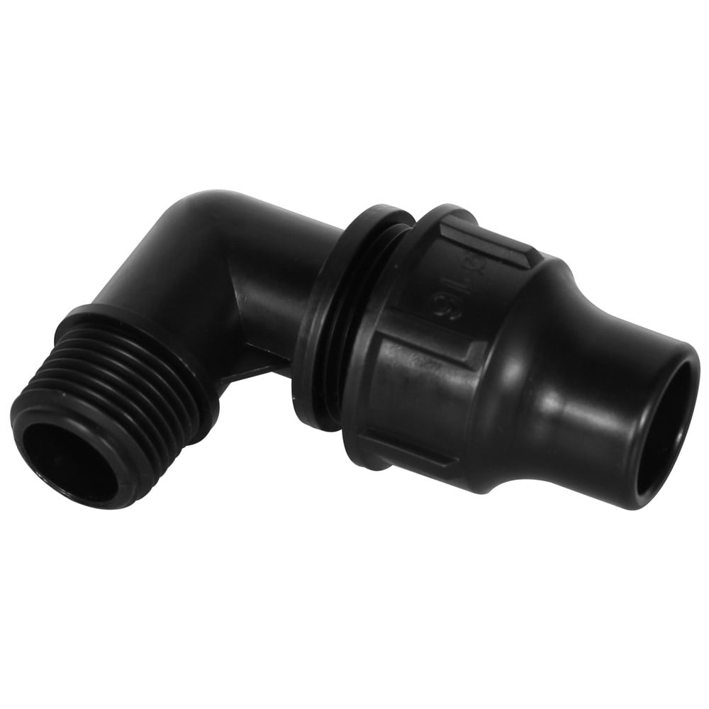 Bërryl me rakord, 16x1/2", mashkull, PE, me kënd 90° përdoret gjërësisht sot në Europë për instalimet këndore të linjave ujësjellëse, vaditjet në bujqësi etj. Ky bërryl bën të mundur degëzimin e rrjetit në kënd 90°. Bashkon tubin LDPE Ø 25 me rakorderi të tjera me anë të filetove. Për bashkimin me fileto rekomandojmë të përdoret teflon ndërsa tubi bashkohet me bërrylin në mënyrë mekanike me rakord. I prodhuar me standarte Europiane, rezistent ndaj lëndëve gërryese dhe projektuar për t'i bërë ballë presionit deri në 6 Bar.