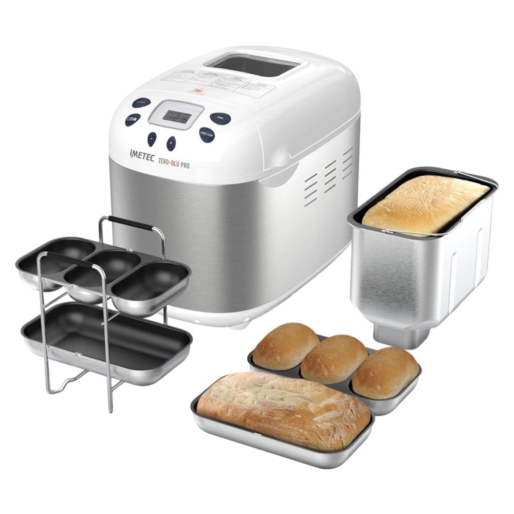 IMETEC ZERO-GLU PRO është një makinë për të bërë bukë shpije, pa gluten, e krijuar posaçërisht për njerëzit me sëmundje celiac dhe intolerancë ndaj glutenit. Me 20 programe të veçanta automatike për miell pa gluten dhe aksesorë të shumtë, me ZERO-GLU PRO mund të përgatisni bukë dhe ëmbëlsira me përzierje pa gluten dhe miell natyral pa gluten si hikërror, oriz, teff, miell proteinash vegjetale të dobishme për diversifikimin e dietës suaj. Në varësi të preferencave dhe nevojave tuaja, ju mund të përdorni teknika të ndryshme të brumit të thartë: maja e birrës, brumë i thartë. Ju gjithashtu mund të përgatisni brumë picash pa gluten për ta pjekur në furrën e shtëpisë tuaj, pica dhe reçel. ZERO-GLU PRO është i lehtë për t'u përdorur: ju futni përbërësit, vendosni programin dhe buka gatuhet në përsosmëri falë nivelit të dyfishtë të gatimit dhe tehut të dyfishtë të zierjes. Mund ta programoni fillimin në mënyrë që buka të jetë gjithmonë e freskët dhe e gatshme për mëngjes, drekë ose meze të lehtë. Ekzistojnë 3 nivele të skuqjes së kores për të zgjedhur: e lehtë, e mesme dhe e errët. Mbulesa e heqshme lahet për pastrim të lehtë. Përfshin aksesorë për pjekjen e bukëve të ndryshme - bukë, baguette dhe role - nje gotë të graduar per lëngjet dhe nje gotë matese për maja dhe sasi të vogla. Përfshihet një libër recetash me shumë receta të ëmbla dhe të shijshme.
