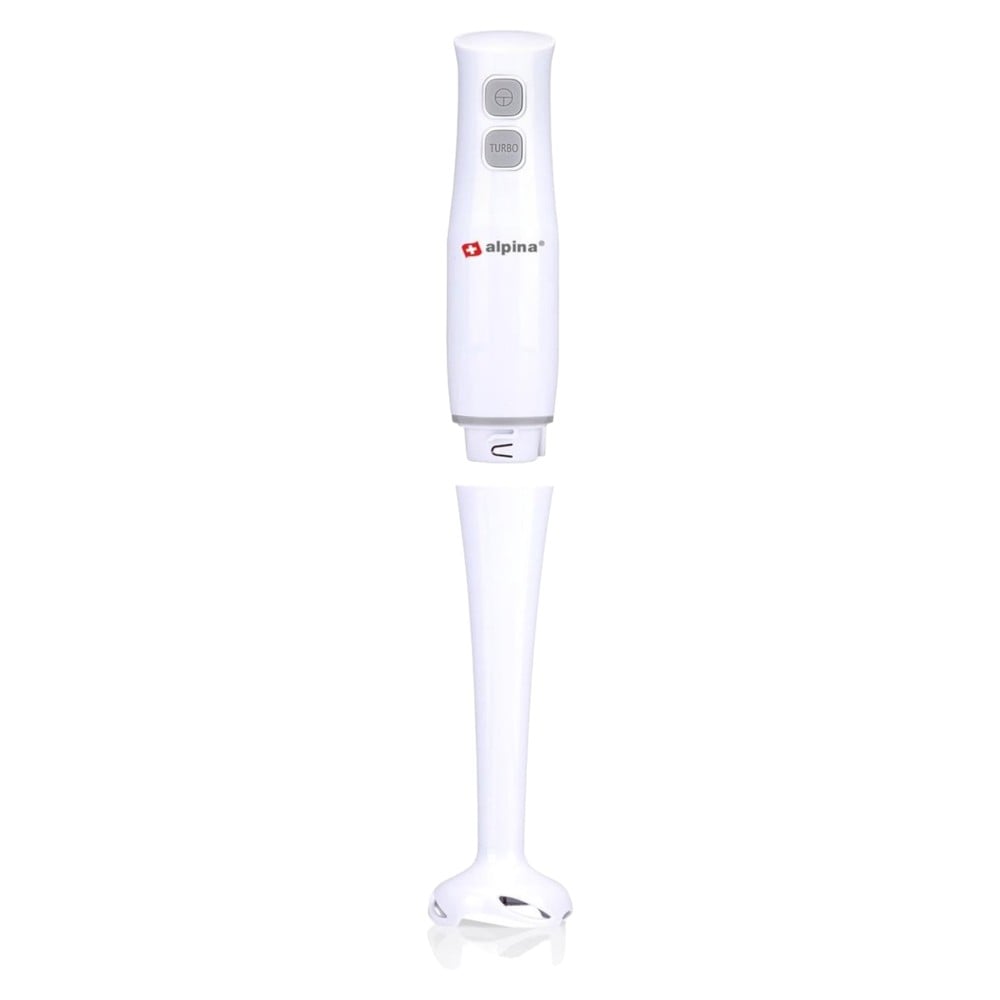 Blenderi i dorës alpina përbëhet nga një strehë plastike e bardhë e fiksuar me tehe të forta çeliku inox. Mund ta përdorni si bar pure për një supë ose salcë të këndshme të butë ose për të bërë smoothie ose milk shake. Ky blender dore është shumë i lehtë për t'u përdorur me butonin e madh që mbani të shtypur gjatë purejes. Nëse e lëshoni butonin, përzierësi do të ndalojë së punuari menjëherë. Blenderi i dorës ka 2 cilësime.