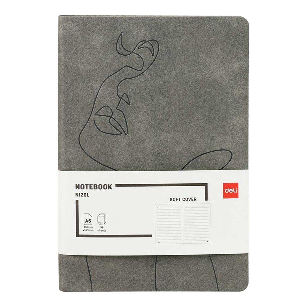 Bllok shenimesh Deli, A5, lëkurë në ngjyrë gri, me 96 fletë. Elegant dhe i qëndrueshëm, ideal për shënime dhe organizimin e tyre.