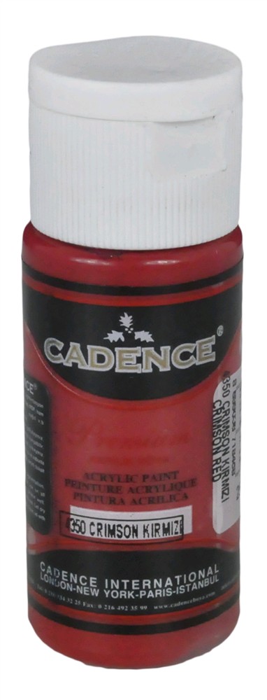 Bojë akrilike shumë përdorimshe. Cilësia e parë e bojërave akrilike përdoret për piktura dekorative. Boja akrilike është me bazë uji dhe jo toksike. Është gjysmë me shkëlqim mund të lyhet me sprite për të krijuar variacione shkëlqimesh. CADENCE ka një gamë të gjërë ngjyrash që mund të përzihen. Ka një qëndrueshmëri të lartë dhe paketime që ju përgjigjet të gjitha nevojave, mbulim të shkëlqyer dhe përzihet lehtë. Kjo bojë mund të përdoret në disa sipërfaqe si: dru, MDF, kanavas, suva, mure, qirinj, pëlhure, lëkure, polisterol, baltë polimer dhe metal.