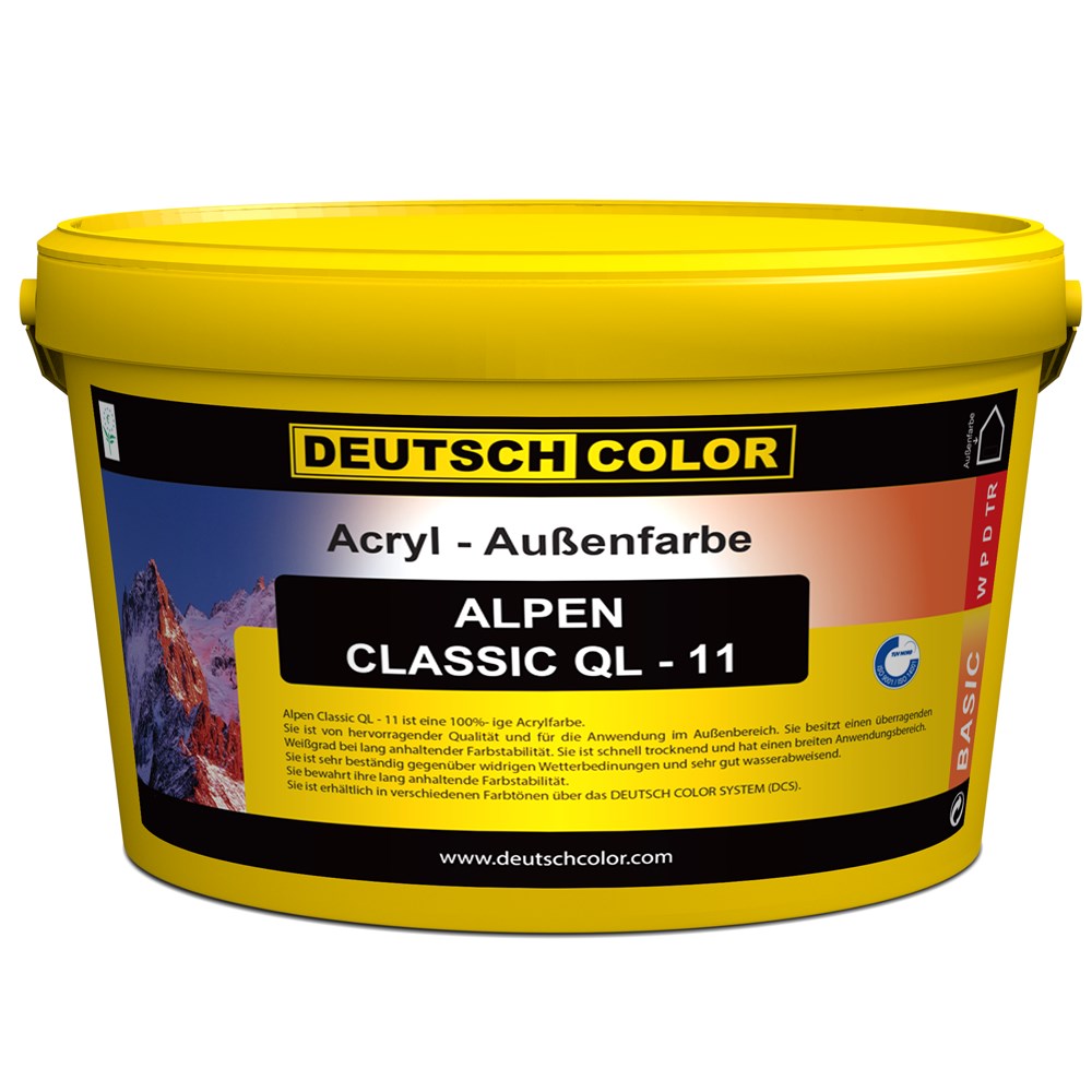 Alpen Classic QL 11 është bojë akrilike me cilësi të shkëlqyera për përdorim të jashtëm. Zotëron punueshmëri dhe aftësi niveluese shumë të mira, ngjitje të fortë dhe tharje të shpejtë.Pas aplikimit, rezultati është një rifiniturë mat me rezistencë tepër të mirë ndaj ujit dhe agjentëve të ndryshëm atmosferikë.