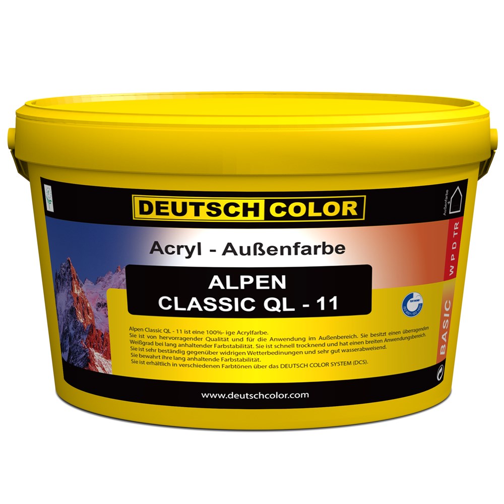 Alpen Classic QL 11 është bojë akrilike me cilësi të shkëlqyera për përdorim të jashtëm. Zotëron punueshmëri dhe aftësi niveluese shumë të mira, ngjitje të fortë dhe tharje të shpejtë.Pas aplikimit, rezultati është një rifiniturë mat me rezistencë tepër të mirë ndaj ujit dhe agjentëve të ndryshëm atmosferikë.
