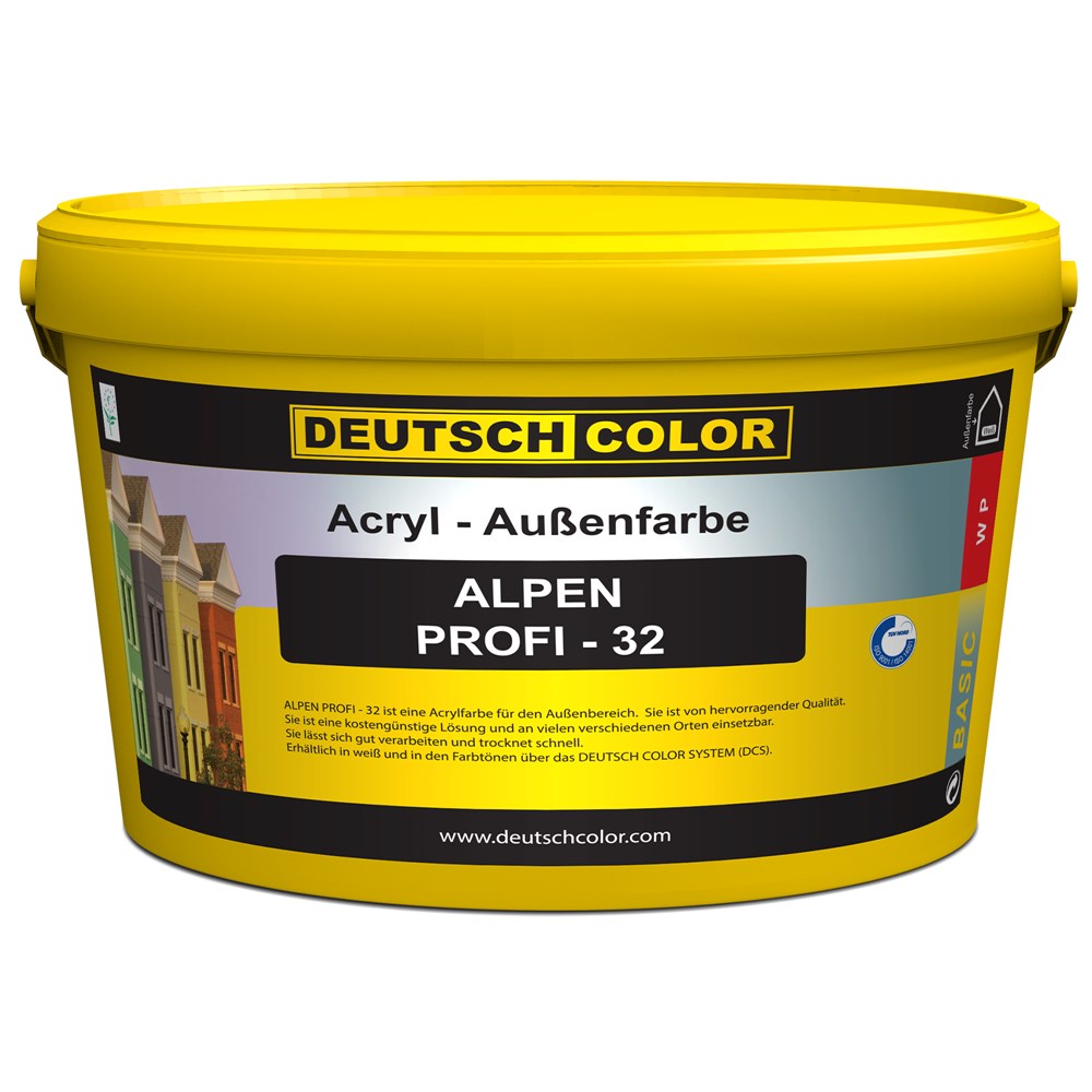 Alpen Profi 32 është bojë akrilike që përdoret për lyerjen e fasadave të jashtme të ndërtesave. Zotëron punueshmëri dhe aftësi niveluese shumë të mira, ngjitje të fortë dhe tharje të shpejtë.Është një produkt shumë ekonomik dhe cilësor për përdorim profesional me performancë të shkëlqyer.