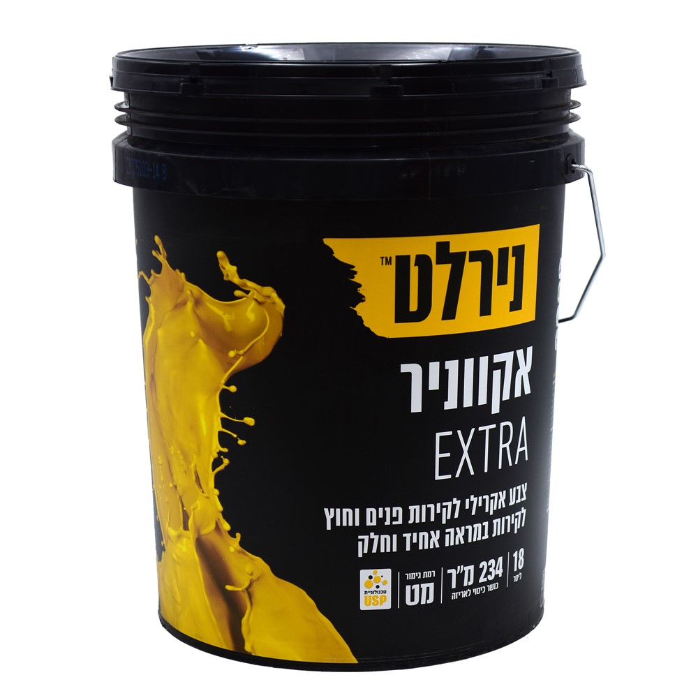 Bojë akrilike Aquanir, 18 Lt, (e bardhë), Baza B. Bojë elastike akrilike me një mbulim të jashtëzakonshëm e përdorshme për brenda dhe jashtë. Mbas lyerjes përftohet një shtresë kadife e butë, e cila i jep murit të shtëpisë një pamje të këndshme, të qetë dhe elegante. E qëndrueshme në kohë dhe e ruan pamjen. NIROCRYL mbart shenjën e standarteve Izrael 1945. Përdorimi tipik: për lyerjen e brendshme dhe të jashtme të mureve. Parapërgatitja e sipërfaqes: pastroni sipërfaqen mirë nga papastërtitë si: gëlqere, pluhur, shtresa lyerje të mëparshme apo graso para se të filloni lyerjen. Sigurohuni që lyerja e mëparshme është e ngjitur mirë pas murit. Hiqini cipat e murit mirë me një mistri dhe një letërzmerile. Pastrimi: veglat dhe duart duhet të pastrohen me ujë dhe sapun menjëherë pas përdorimit. Karakteristikat e shtresës së lyerjes: nuanca e ngjyrimit: e bardhë plus 1500 nuanca nga katalogu i këndshëm NITLAT. Niveli i shkëlqimit: mat. Të dhënat materiale: përzjerie akrilike e bazuar në ujë dhe substanca minerale. Tretja: me ujë deri në 20% për shtresën e parë. 10% për shtresën e dytë. Aftësia e mbulimit: 16 m2 për litër në dy shtresa. Viskoziteti: 98KU ± 10%. Aftësia e mbulimit është e llogaritur sipas matjes së punës të një punëtori me përvojë dhe me aftësi, me një gradë të ndryshme përvetësimi dhe mund të ndryshojë në varësi të metodës së punimit, sipërfaqes dhe kushteve klimaterike. Kufizimet: mos e aplikoni bojën kur temperatura është nën 7°C ose kur parashikohet shi. Kohëzgjatja e tharjes: për rilyerje: 2 orë (në kushte normale të motit). Për ta prekur: 1 orë. Tharja e plotë: 24 orë.