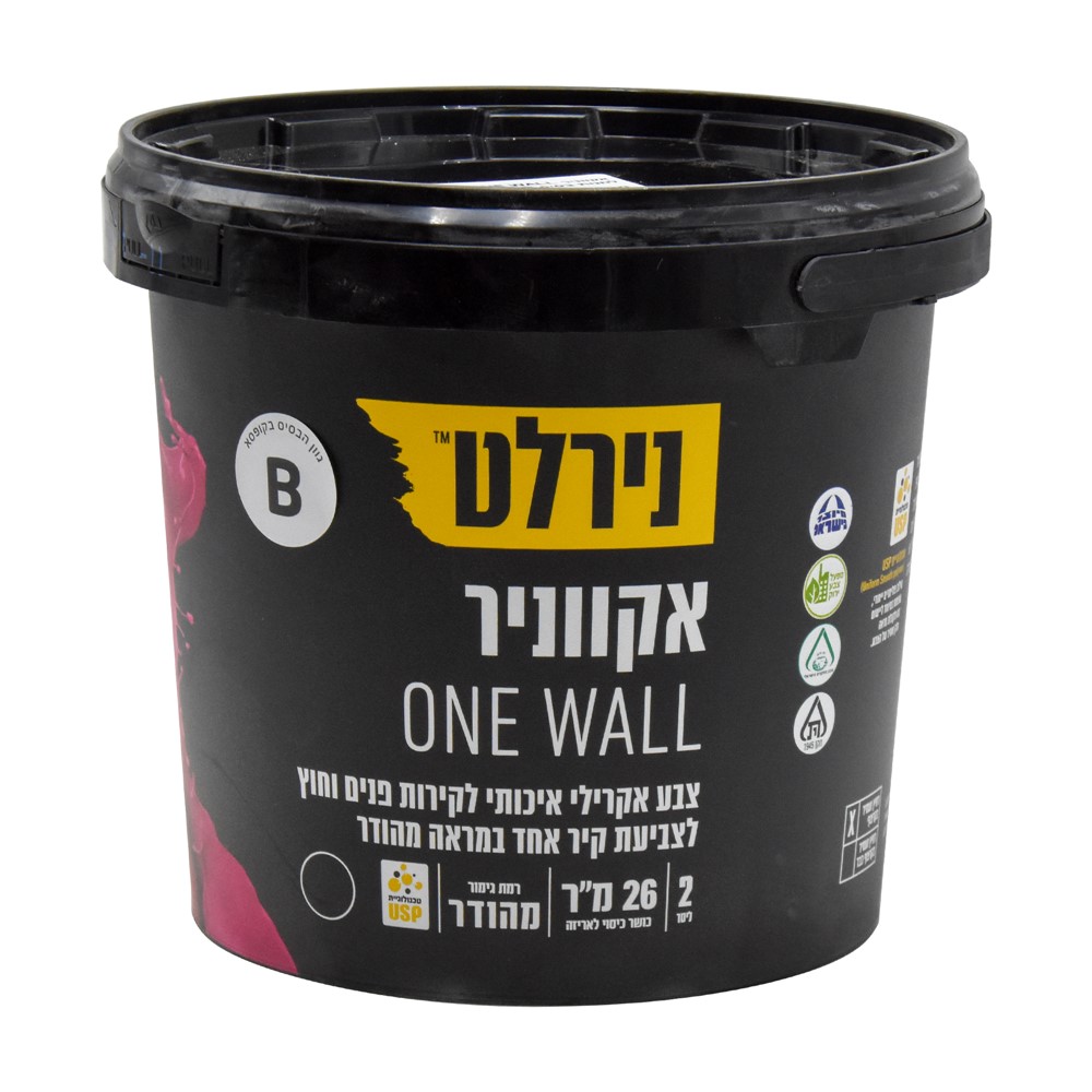 Bojë akrilike One Wall, 2 Lt, Baza B. Bojë elastike akrilike me një mbulim të jashtëzakonshëm, e përdorshme për brenda dhe jashtë. Mbas lyerjes përftohet një shtrese kadife e butë, e cila i jep murit të shtëpisë një pamje të këndshme, të qetë dhe elegante. E qëndrueshme në kohë dhe e ruan pamjen. Nirocryl mbart shenjën e standarteve Izrael 1945. Përdorimi tipik: për lyerjen e brendshme dhe të jashtme të mureve. Parapërgatitja e sipërfaqes: pastroni sipërfaqen mirë nga papastërtitë si: gëlqere, pluhur, shtresa lyerjeje të mëparshme, graso etj, para se të filloni lyerjen. Sigurohini që lyerja e mëparshme është e ngjitur mirë pas murit. Hiqini cipat e murit mirë me një mistri dhe një letërzmerile. Pastrimi: veglat dhe duart duhet të pastrohen me ujë dhe sapun menjëherë pas përdorimit. Karakteristikat e shtresës së lyerjes: nuanca e ngjyrimit: e bardhë plus 1500 nuanca nga katalogu i këndshëm nirlat. Niveli i shkëlqimit: mat. Të dhënat materiale: përzjerie akrilike e bazuar në ujë dhe substanca minerale. Tretja: me uje deri në 20% për shtresën e parë. 10% për shtresën e dytë. Aftësia e mbulimit: 16 m2 për litër në dy shtresa. Viskoziteti: 98KU ± 10%. Aftësia e mbulimit është e llogaritur sipas matjes së punës të një punëtori me përvojë dhe me aftësi, me një gradë të ndryshme përvetësimi dhe mund të ndryshojë në varësi të metodës së punimit, sipërfaqes dhe kushteve klimaterike. Kufizimet: mos e aplikoni bojën kur temperatura është nën 7°C ose kur parashikohet shi. Kohëzgjatja e tharjes. Për rilyerje: 2 orë (në kushte normale te motit). Për ta prekur: 1 orë. Tharja e plotë: 24 orë.