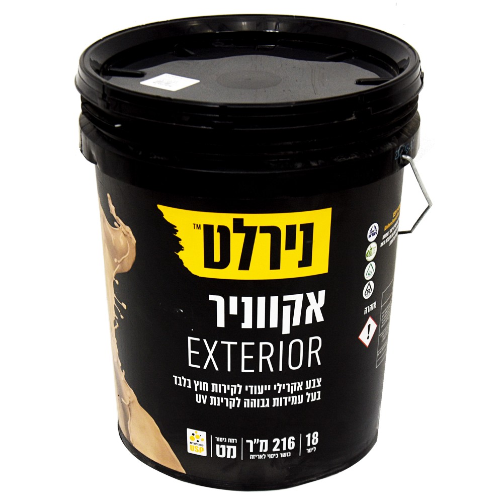 Bojë akrilike Aquanir, 18 Lt, Baza C. Bojë elastike akrilike me një mbulim të jashtëzakonshëm, e përdorshme për jashtë. Mbas lyerjes përftohet një shtrese kadife e butë, e cila i jep murit të shtëpisë një pamje të këndshme, të qetë dhe elegante. E qëndrueshme në kohë dhe e ruan pamjen. Nirocryl mbart shenjën e standarteve Izrael 1945. Përdorimi tipik: për lyerjen e jashtme të mureve. Parapërgatitja e sipërfaqes: pastroni sipërfaqen mirë nga papastërtitë si: gëlqere, pluhur, shtresa lyerjeje të mëparshme, graso etj, para se të filloni lyerjen. Sigurohini që lyerja e mëparshme është e ngjitur mirë pas murit. Hiqini cipat e murit mirë me një mistri dhe një letërzmerile. Pastrimi: veglat dhe duart duhet të pastrohen me ujë dhe sapun menjëherë pas përdorimit. Karakteristikat e shtresës së lyerjes: nuanca e ngjyrimit: e bardhë plus 1500 nuanca nga katalogu i këndshëm nirlat. Niveli i shkëlqimit: mat. Të dhënat materiale: përzjerie akrilike e bazuar në ujë dhe substanca minerale. Tretja: me uje deri në 20% për shtresën e parë. 10% për shtresën e dytë. Aftësia e mbulimit: 16 m2 për litër në dy shtresa. Viskoziteti: 98KU ± 10%. Aftësia e mbulimit është e llogaritur sipas matjes së punës të një punëtori me përvojë dhe me aftësi, me një gradë të ndryshme përvetësimi dhe mund të ndryshojë në varësi të metodës së punimit, sipërfaqes dhe kushteve klimaterike. Kufizimet: mos e aplikoni bojën kur temperatura është nën 7°C ose kur parashikohet shi. Kohëzgjatja e tharjes. Për rilyerje: 2 orë (në kushte normale te motit). Për ta prekur: 1 orë. Tharja e plotë: 24 orë.