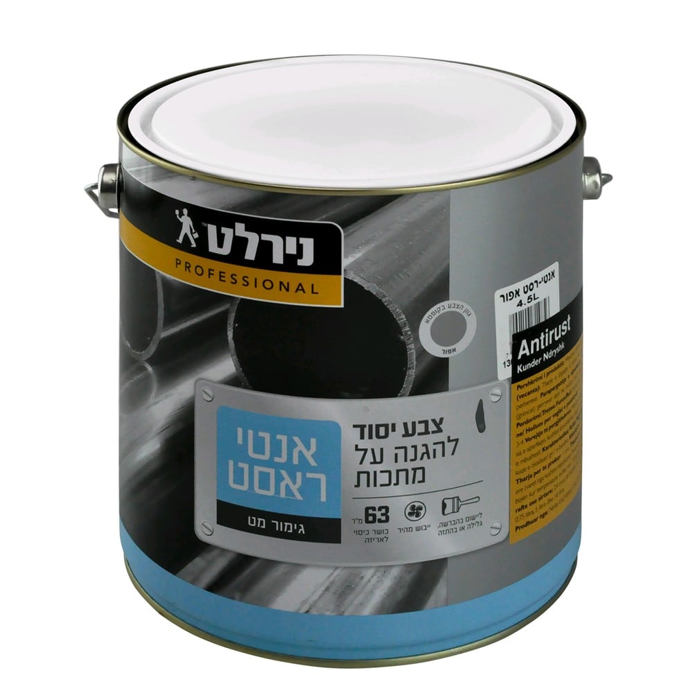 Boje kunder ndryshkut 4.5 L ngjyre gri. Boje sintetik per mbrojtjen e hekurit nga ndryshku.Thahet shpejt, e lehte ne perdorim. Parapergatitja e siperfaqes: Hiqni cdo shtrese ndyre dhe vaji nga siperfaqa qe do te lyhet. Hollimi 5-10 % me terpentine (032). Mbulimi praktik varet nga kushtet e siperfaqes qe do te lyhet, vrazhdesia e siperfaqes, kushtet atmosferike, vegla e perdorimit etj. Mbulimi teoretik: 10 m² per L. Shkelqimi: Mat. Tharja per te prekur: 1 ore. Koha per te rilyer: 16-24 ore (varet nga kushtet mjedisore). Perqindje e ngurtesise (nga pesha): 74%. Kufizimet: Mos e aplikoni bojen kur temperatura eshte nen 7 grade Celcius ose kur parashikohet te bjere shi.