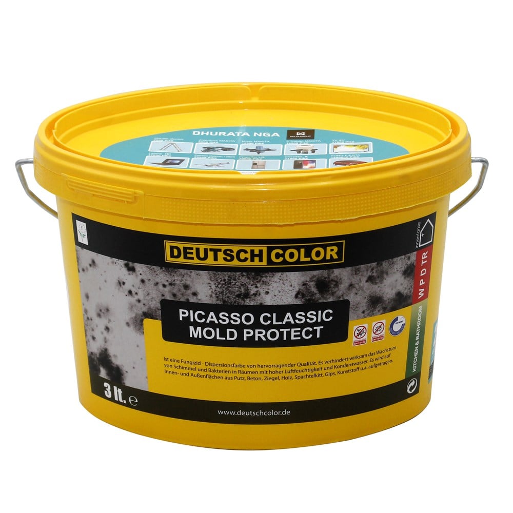 PICASSO CLASSIC MOLD PROTECT: bojë emulsioni shkatërruese kërpudhash me cilësi të shkëlqyeshme për përdorim të brendshëm. Ndalon rritjen e mykut dhe baktereve, mbron nga krijim i cipave të thata, mbulueshmëri e shkëlqyer, sipërfaqe e lëmuar mat, punueshmëri dhe nivelim i shkëlqyer, ngjitje shumë e fortë dhe tharje e shpejtë. Mund të përdoret në: sipërfaqet e brendshme të llaçit, betonit, tullës, drurit, llaçit, gipsit, plastikës etj. Zona me lagështi të lartë dhe kondensimin e avujve si kuzhina, banjo, tavane, bodrume. Sipërfaqet duhet të jenë të pastra, të thata dhe të lira nga të gjitha materialet e dëmtuara dhe defektoze, pluhurat, papastërtitë, vajrat dhe kripërat. Rekomandohet që sipërfaqet e lyera të mos lahen deri në 20-30 ditë pas aplikimit. Në sipërfaqe të betonit të freskët produkti rekomandohet të aplikohet të paktën pas 30-40 ditësh. Rekomandohet që të shmanget aplikimi i produktit në temperatura nën 5°C.