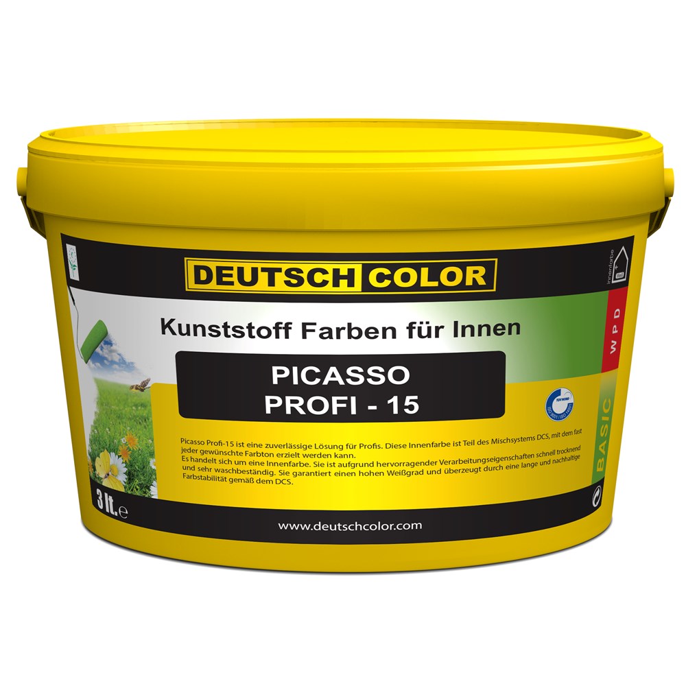 Picasso Profi 15 është bojë plastike, funksionale për lyerjen e ambjenteve të brendshme të ndërtesave. Ajo ka një veti mbuluese shumë të mirë, bardhësi dhe ngjyra të qëndrueshme që zgjasin në kohë. Aplikohet lehtësisht dhe ka aftësi niveluese shumë të mira, ngjitje të fortë dhe tharje të shpejtë. Përfundimi do të jetë një sipërfaqe mat me rezistencë të lartë ndaj agjentëve gërryes.