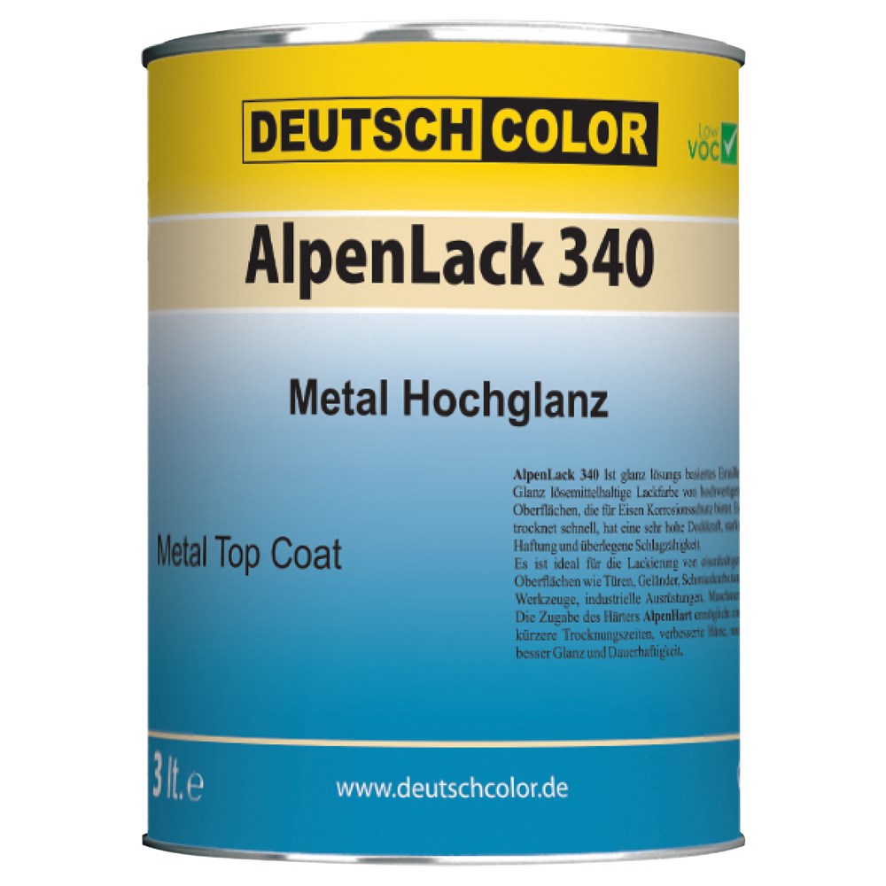 AlpenLack 340 është zmalto alkide që përdoret për lyerjen e sipërfaqeve prej metali, e cila siguron mbrojtje nga korrozioni. Ofron një mbulim dhe nivelim të përsosur, tharje të shpejtë, ngjitje shumë të mirë me sipërfaqen si dhe rezistencë të lartë ndaj agjentëve atmosferike dhe kimik. Eshtë ideal për lyerjen e sipërfaqeve metalike si dyer, paisje të ndryshme industriale etj.