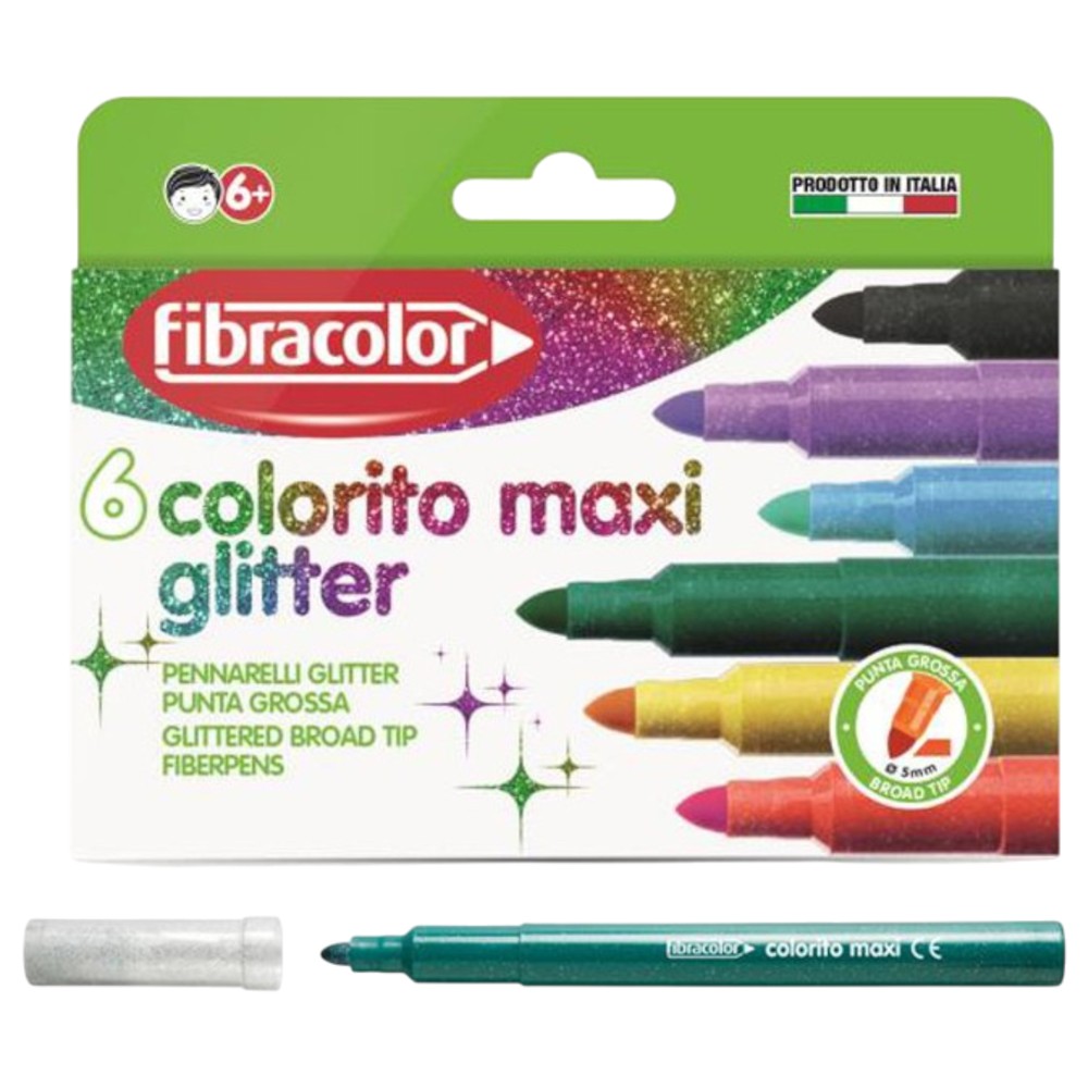 Ky set përmban 6 markerë me ngjyra brilante dhe efekt glitter, me majë Maxi (5 mm) për vizatime të trashë dhe efekt të dukshëm. Këta markerë janë idealë për dekorime, kartolina, projekte vizuale dhe aktivitete kreative për fëmijë dhe të rritur.