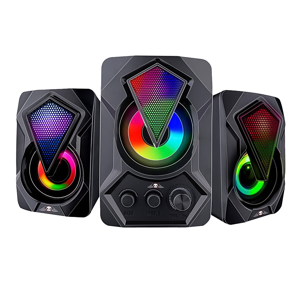 Altoparlantët me ndriçim No Fear. Ky grup altoparlantësh mund të lidhet me çdo pajisje që mbështet Bluetooth, ose të lidhet me një kabllo nëpërmjet AUX. Altoparlantët USB janë idealë për t'u përdorur si grup altoparlantësh për PC. Altoparlantët lëshojnë dritë në ngjyra të ndryshme dhe volumi i basit, trefishtë dhe totali mund të rregullohen në altoparlant. Furnizimi me energji USB (5V, 1000 mA). Lidhja: Me AUX ose Bluetooth