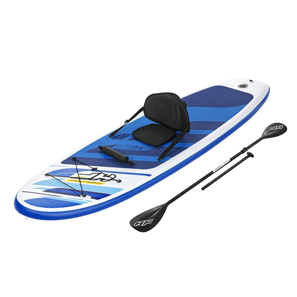 Dilni në ujë me Hydro-Force™ SUP Oceana. Është dizenjuar si një bord gjithëpërfshirëse, duke e bërë atë të gjithanshëm. Plus, me sediljen dhe mbështetësen e këmbëve të përfshira, Oceana konvertohet lehtësisht në një kajak, ndërtim i qëndrueshëm: Ky SUP është bërë nga materiali DropStitch™. Pjesa e sipërme dhe e poshtme e bordit janë të lidhura me njëra-tjetrën brenda me mijëra fije. Kjo i jep SUP-it forcën e një dërrase të fortë, por gjithsesi garanton vetitë e një produkti të fryrë. Karakteristikat: Me dorezën praktike mund ta transportoni lehtësisht SUP-in në dhe nga uji. Shiriti elastik në SUP ju ofron hapësirë shtesë për ruajtjen e sendeve tuaja personale. Pllaka ka gjithashtu një sipërfaqe që nuk rrëshqet, e cila ju ndihmon të ruani ekuilibrin dhe stabilitetin gjatë vozitjes. Lehtë për t'u vendosur: thjesht fryni SUP-in me pompën e dorës së dhënë dhe mund të filloni udhëtimin tuaj në ujë! SUP mund të zbrazet po aq pa mundim. Valvula e ajrit e lehtë për t'u përdorur ndihmon për këtë. Më pas thjesht rrotullojeni Oceanën dhe ruajeni në çantën e shpinës së ofruar.