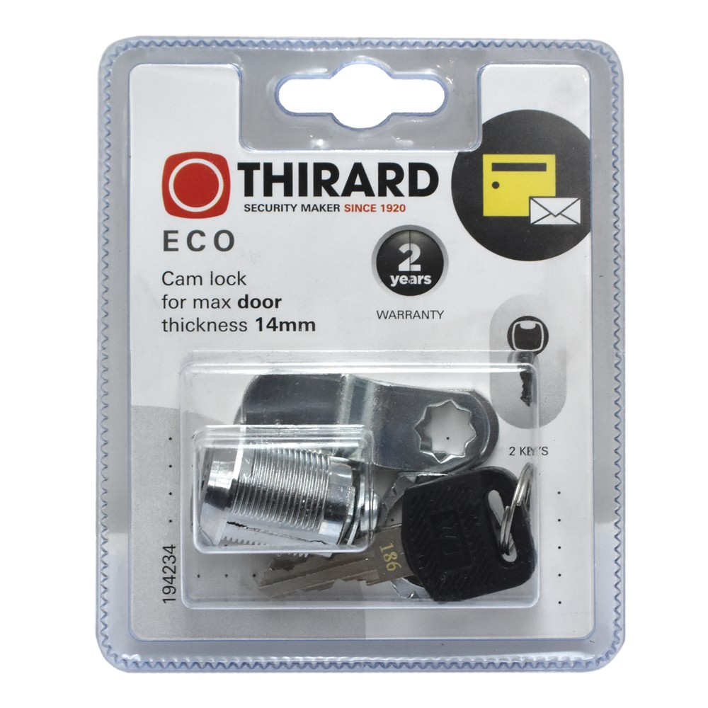 Moulded alloy body. Disc tumblers mechanism. Flat cam. 2 nickel plated keys with head protector by a PVC shell. Nut and fixing click.