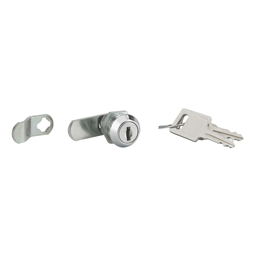 Moulded alloy body. Disc tumblers mechanism. Flat cam + blended cam. 2 nickel plated keys. Fixing nut.
