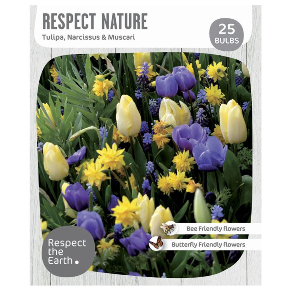 Bulba, respektoni natyrën, pashkët, 25 cop/pako, 7 cop tulipa triumph purple prince, sunny prince, 5 cop narcissus botanical double tete boucle, 13 cop muscari armeniacum