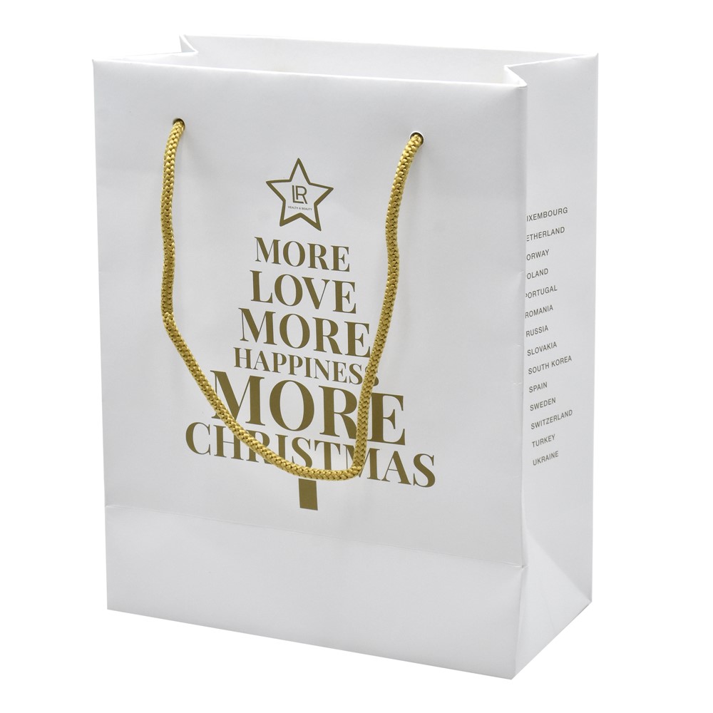 Çantë dhuratash për Krishtlindje, prej materiali kartoni, në ngjyrë të bardhë, me shkrim të printuar në ngjyrë floriri dhe me doreza. Ky produkt përdoret për paketimin e dhuratave të ndryshme.