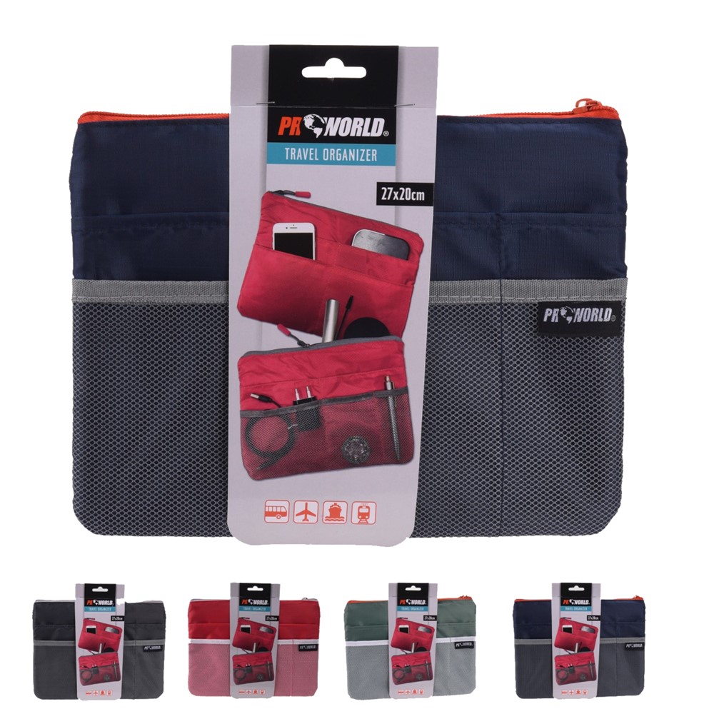 Çantë organizimi për udhëtim, prej materiali poliestre, në ngjyra të ndryshme, e pajisur me një xhep të madh me zinxhir, me 7 xhepa të jashtëm në madhësi të ndryshme dhe me 3 xhepa të jashtëm prej rrjete. Përdoret për ruajtjen dhe transportimin e produkteve të higjienës personale dhe aksesorëve të ndryshëm, si celularë, stilolapsa, karikues, bateri të jashtme, blloqe shënimesh, etj., si dhe për organizimin e tyre në çantat e udhëtimit. Ky produkt është i lehtë dhe ka përmasa kompakte, që e bëjnë të përshtatshëm për t'u marrë me vete në udhëtime.