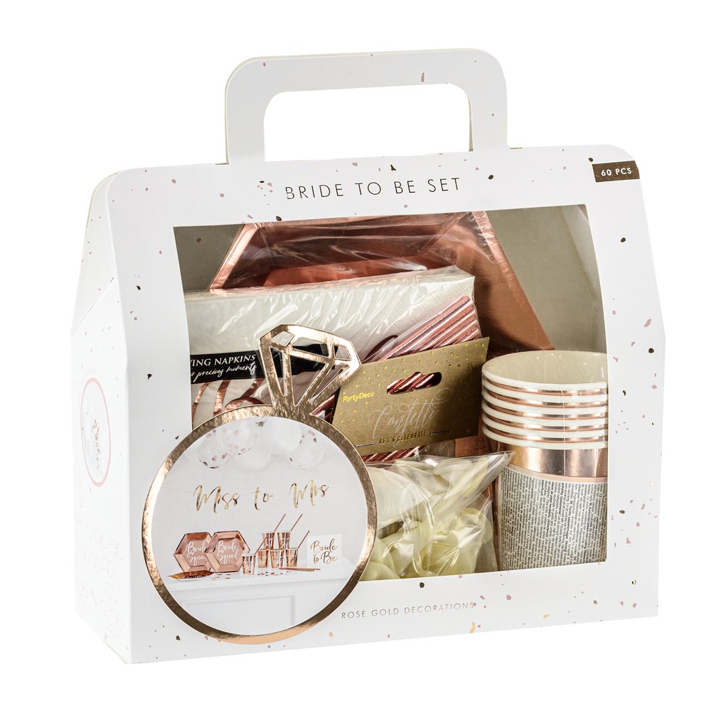 Dekorime për Bachelorette (festë beqarie) të vendosura në ngjyrën e artë të trëndafilit, set përmban: varg Miss për Zonjën (1 copë), gota letre (6 copë), pjata letre (6 copë), kashtë letre (10 copë), peceta letre (20 copë), konfetë (15 g) dhe tullumbace latex bardhë), 10 copë dhe Crystal Clear, 6 copë).