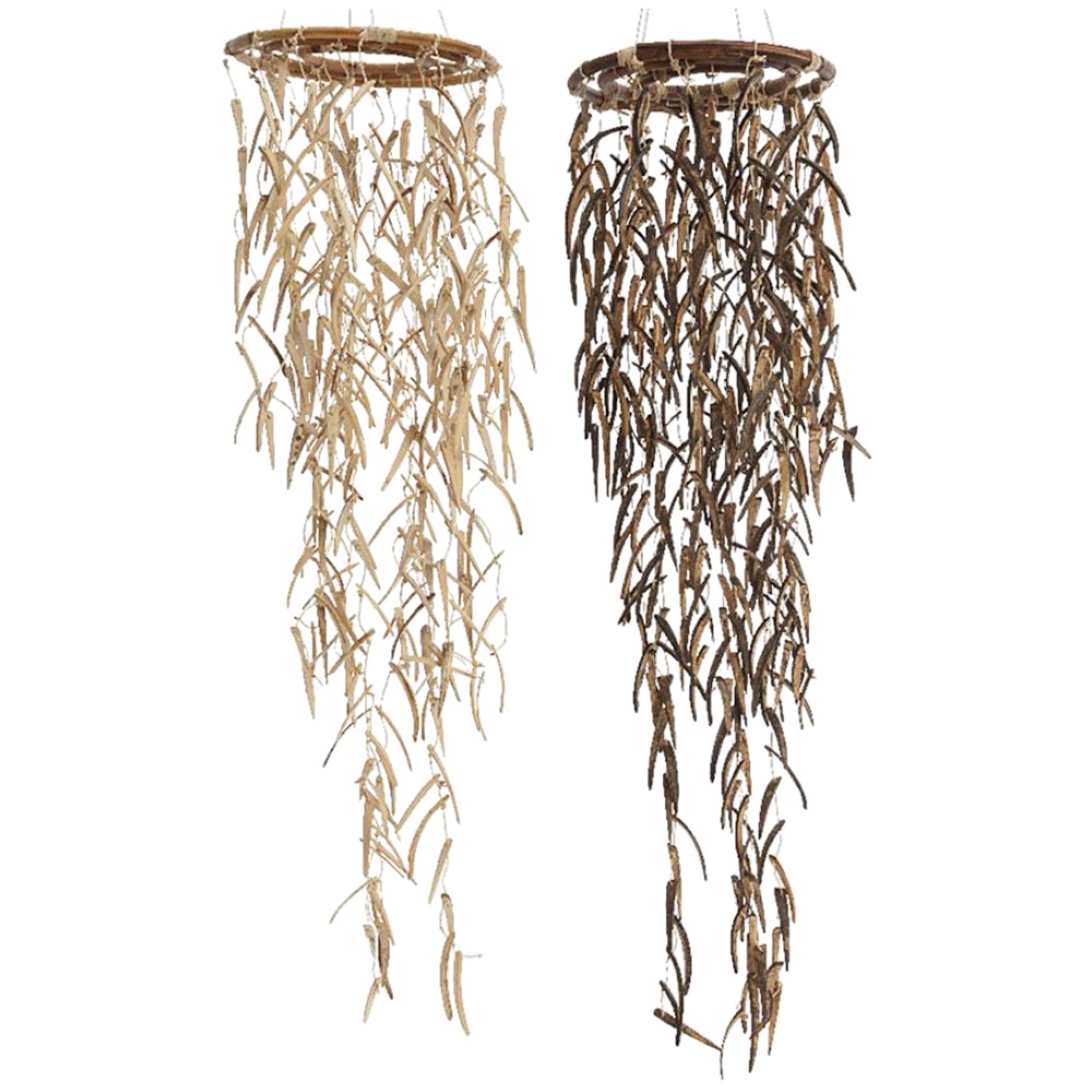 Dekorimi i murit nga materiale natyrale është i thjeshtë dhe me këmbë në tokë. Rruazat prej druri dhe vargu si bari krijojnë një pamje bohemiane.