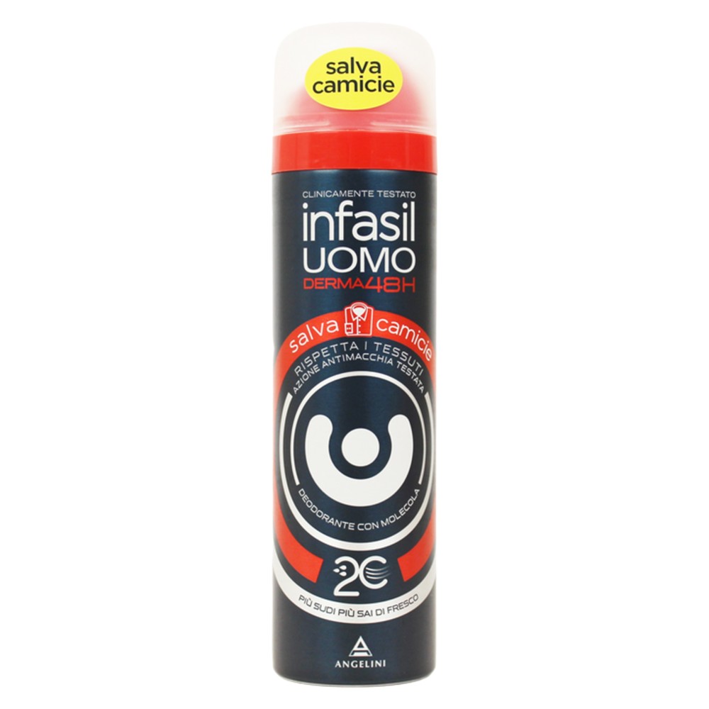 Deodoranti i krijuar posaçërisht për të mbrojtur veshjet e meshkujve: formula kundër njollave të Infasil Uomo Derma48H Salvacamicie është testuar në fibrat më të përdorura si pambuku, këmisha dhe bluza. Mbrojtje e pakompromis deri në 48H falë teknologjisë së jashtëzakonshme me MOLECULA 2C, Betacyclodextrin. Testuar në lëkurë të ndjeshme.