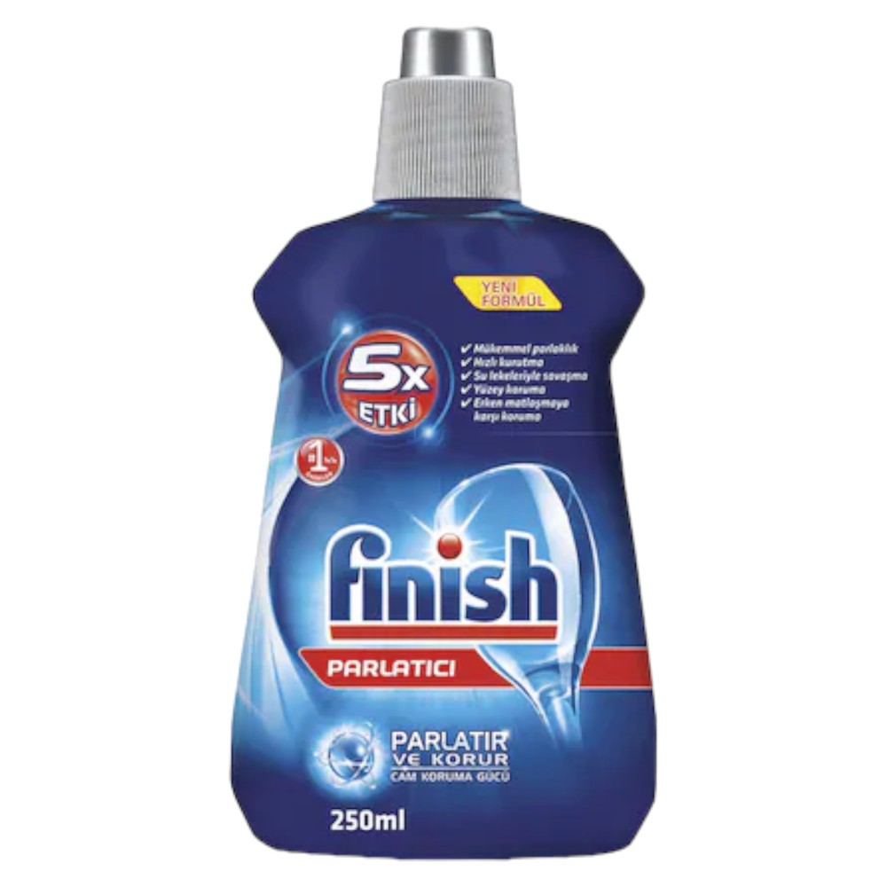 Detergjenti Finish gjatë larjes në lavastovilje, ofron pjata më të shndritshme dhe më të thata, eleminon mbetjet e shpëlarjes, kohë më të shpejtë tharjeje, zvogëlon njollat e ujit, ofron shkëlqim të enëve.