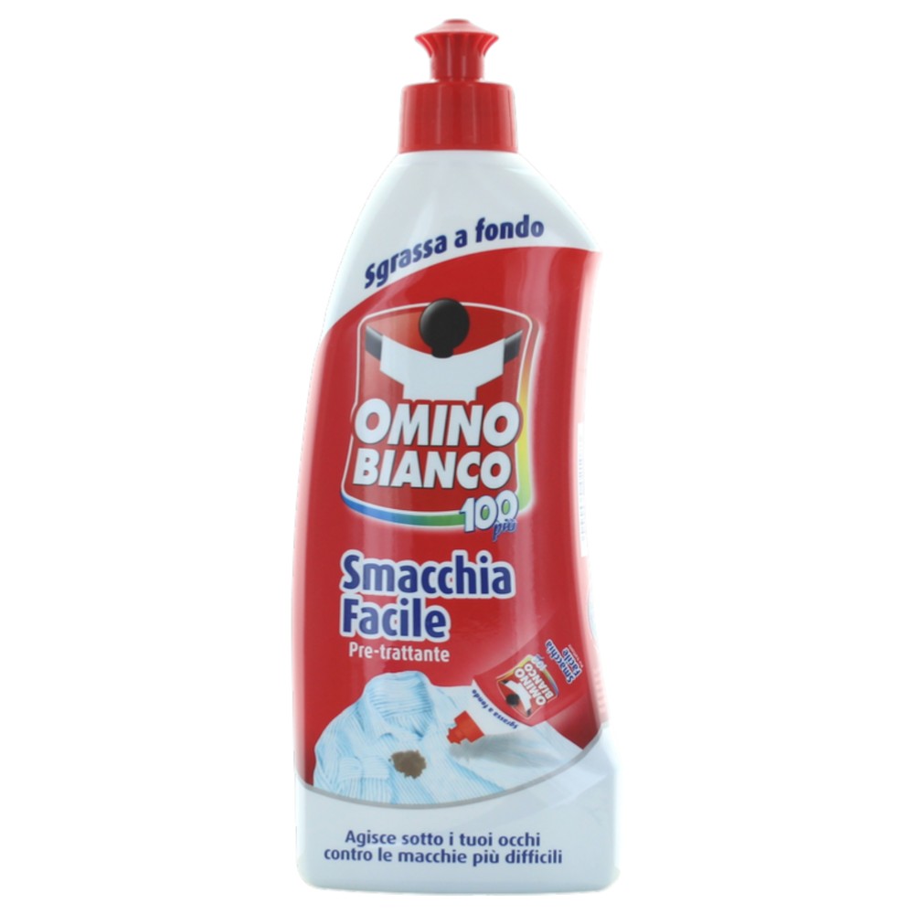 Omino Bianco Smacchiafacile është një paratrajtues efektiv dhe i sigurt për njollat më të vështira, si kafe, verë, yndyrë, fruta, bar dhe gjalpë. Ai përgatit rrobat për larje duke siguruar rezultate të shkëlqyera në heqjen e njollave pa dëmtuar fibrat.