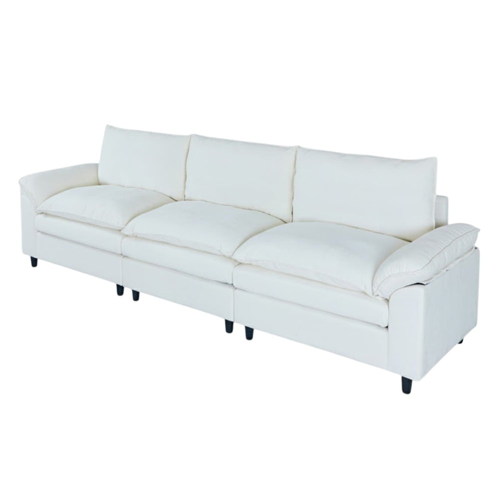 Ky divan 3-vendësh në ngjyrë të bardhë sjell në çdo ambient një ndjesi elegance, pastërtie dhe dritë. Tapiceria prej tekstili cilësor ofron butësi dhe rehati maksimale, ndërsa korniza e fortë prej druri siguron qëndrueshmëri dhe mbështetje afatgjatë. Këmbët plastike me dizajn modern e bëjnë divanin të lehtë për t’u lëvizur, pa kompromentuar stabilitetin apo stilin. Me përmasat 299x137xH100 cm, ai ofron hapësirë të bollshme për tre persona, ideal për çaste pushimi, biseda të ngrohta apo momente relaksi në familje. Ngjyra e bardhë i shton sofistikim dhe dritë çdo dhome, duke e bërë këtë divan një zgjedhje perfekte për ata që duan një kombinim harmonik midis thjeshtësisë, elegancës dhe komoditetit.