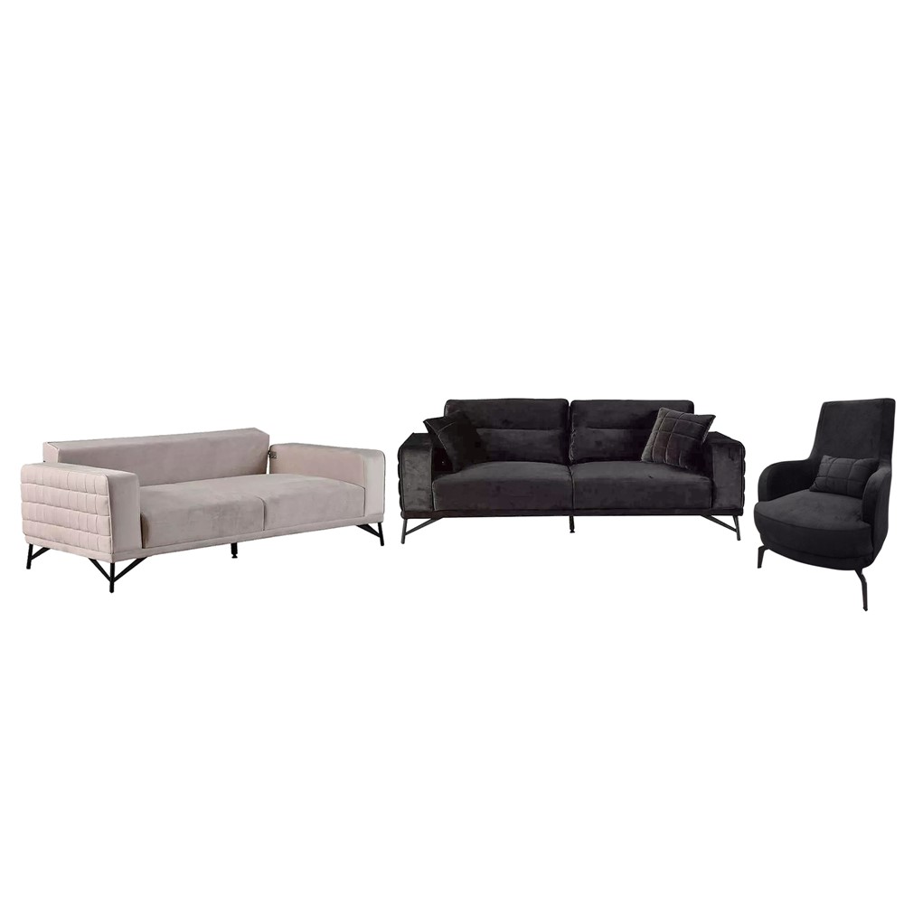 Divan, 3-vendësh (x2) + 1 kolltuk, këmbë metalike, tapiceri tekstili, antrasit/bezhë, divani: 230x90xH85 cm; kolltuku: 70x80xH100 cm