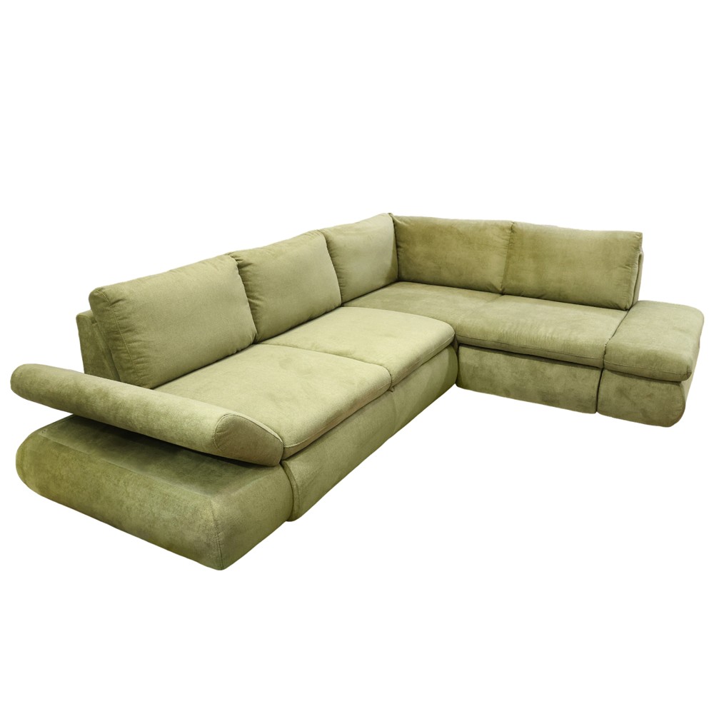 Divan këndor, me kanape në anën e djathtë, me përmasa 300x224 cm, me tapiceri tekstili, në ngjyrë jeshile të errët. Struktura mbajtëse është e përbërë nga shufra rezistente druri ahu dhe bredhi, si dhe material melamine, pa përmbajtje formaldehidesh. Mbushja e brendshme mesatarisht e butë përbëhet nga materiale sfungjeri, pa PVC, me susta çeliku përforcuese. Divani është i pajisur me 2 pjesë mbështetëse të lëvizshme, të cilat mund të përshtaten për të ofruar komfort maksimal, ka një hapësirë magazinimi që hapet dhe këmbë statike kromi me lartësi 4.2 cm. Ndenjësja e divanit mund të hapet duke lejuar që të kthehet në një krevat, me sipërfaqe 213x129 cm. Materiali veshës është rezistent ndaj njollave dhe mund të pastrohet lehtësisht me një pecetë të lagur. Dizajni minimalist dhe funksional e bën këtë produkt një zgjedhje optimale për ambientet tuaja të brendshme.
