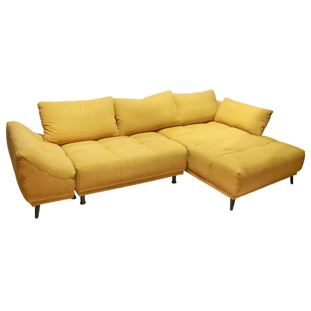 Divan këndor, me kanape në anën e djathtë, me përmasa 270x169 cm, me tapiceri tekstili, në ngjyrë mustardë. Struktura mbajtëse është e përbërë nga shufra rezistente druri ahu dhe bredhi, si dhe material melamine, pa përmbajtje formaldehidesh. Mbushja e brendshme mesatarisht e fortë përbëhet nga materiale sfungjeri, pa PVC, me susta çeliku përforcuese. Divani është i pajisur me një hapësirë magazinimi që hapet dhe këmbë statike metali. Materiali veshës është rezistent ndaj njollave dhe mund të pastrohet lehtësisht me një pecetë të lagur. Dizajni minimalist dhe funksional e bën këtë produkt një zgjedhje optimale për ambientet tuaja të brendshme.