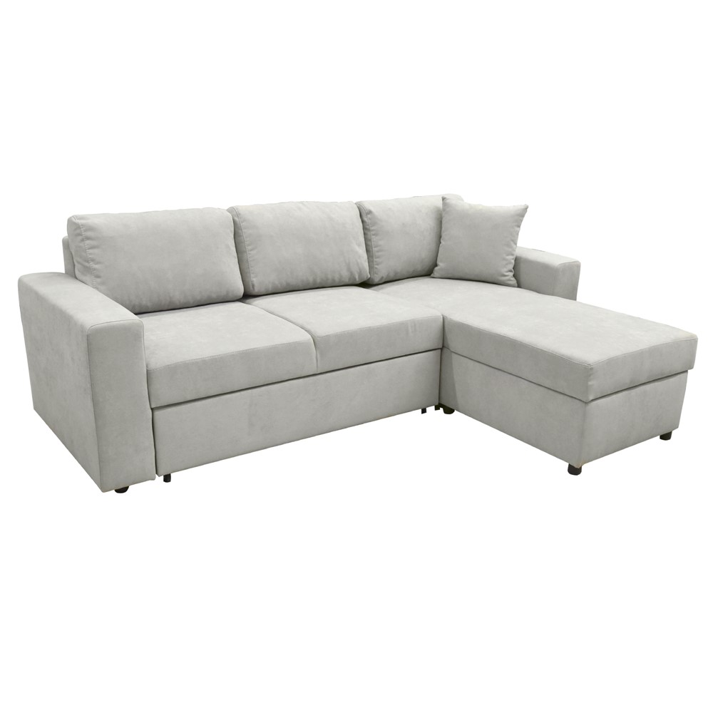 Divan këndor, djathtas, hapje krevat, strukturë druri, tapiceri tekstili, gri, 230x160xH90 cm