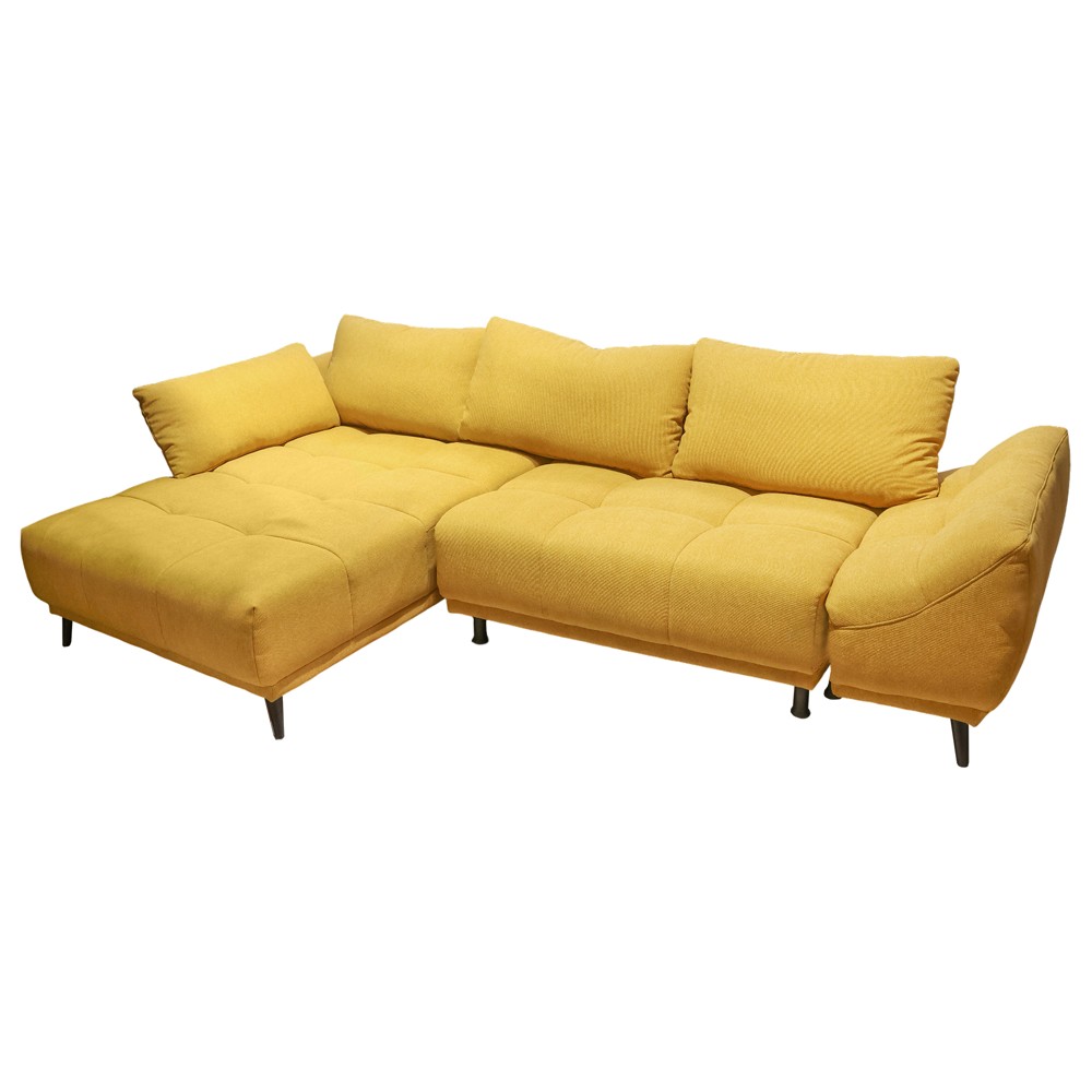 Divan këndor, me kanape në anën e majtë, me përmasa 270x169 cm, me tapiceri tekstili, në ngjyrë mustardë. Struktura mbajtëse është e përbërë nga shufra rezistente druri ahu dhe bredhi, si dhe material melamine, pa përmbajtje formaldehidesh. Mbushja e brendshme mesatarisht e fortë përbëhet nga materiale sfungjeri, pa PVC, me susta çeliku përforcuese. Divani është i pajisur me një hapësirë magazinimi që hapet dhe këmbë statike metali. Materiali veshës është rezistent ndaj njollave dhe mund të pastrohet lehtësisht me një pecetë të lagur. Dizajni minimalist dhe funksional e bën këtë produkt një zgjedhje optimale për ambientet tuaja të brendshme.