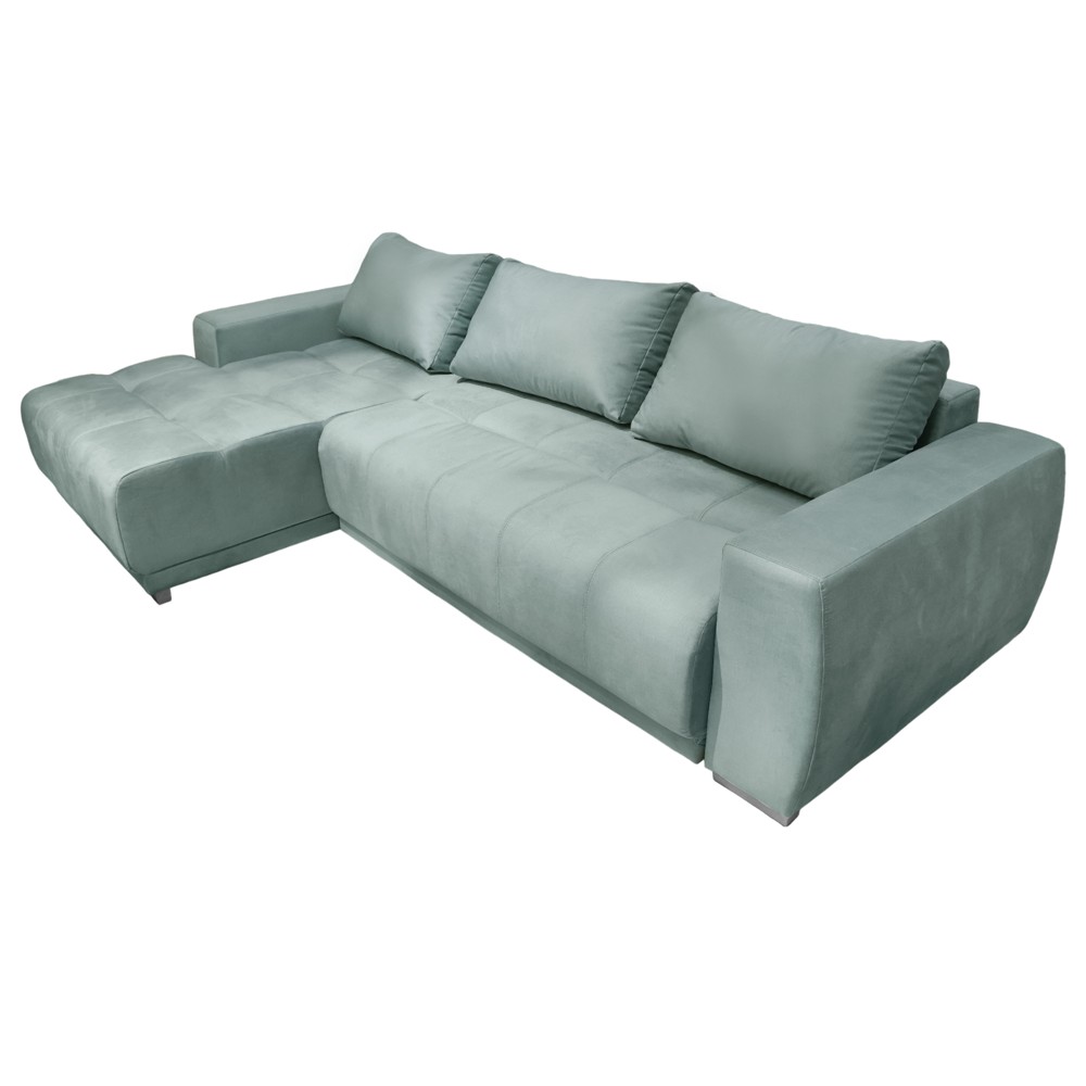 Divan këndor, me kanape në anën e majtë, me përmasa 280x204x66(87) cm, me tapiceri tekstili, në ngjyrë jeshile taupe. Struktura mbajtëse është e përbërë nga shufra rezistente druri ahu dhe bredhi, si dhe material melamine, pa përmbajtje formaldehidesh. Mbushja e brendshme mesatarisht e butë përbëhet nga materiale sfungjeri, pa PVC, me susta çeliku përforcuese dhe këmbë statike kromi. Ndenjësja e divanit mund të hapet duke lejuar që të kthehet në një krevat, me sipërfaqe 230x130 cm. Materiali veshës është rezistent ndaj njollave dhe mund të pastrohet lehtësisht me një pecetë të lagur. Dizajni minimalist dhe funksional e bën këtë produkt një zgjedhje optimale për ambientet tuaja të brendshme.