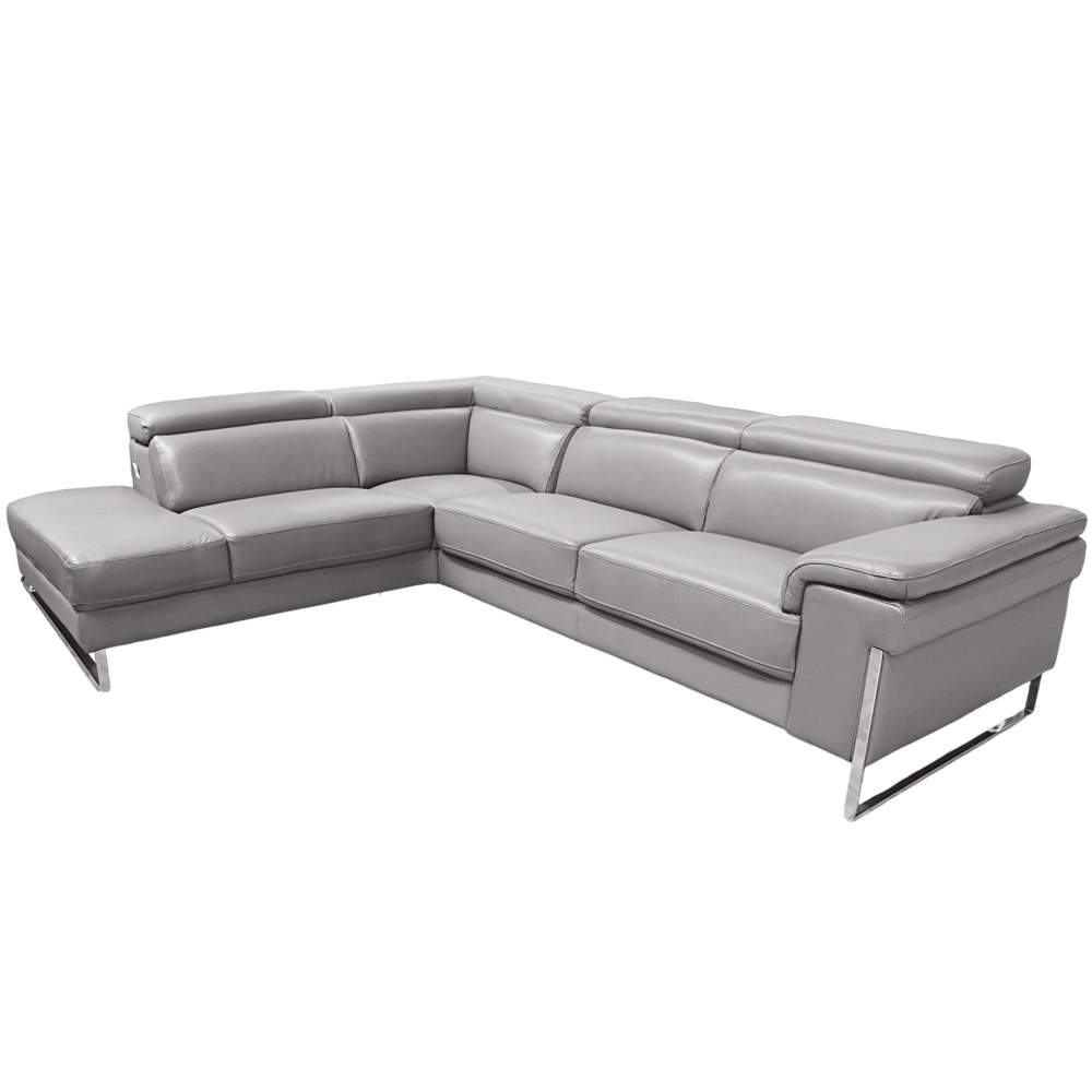 Divan këndor, majtas, lëkurë, këmbë inoksi, gri e lehtë, (293x232)x105xH81/100 cm
