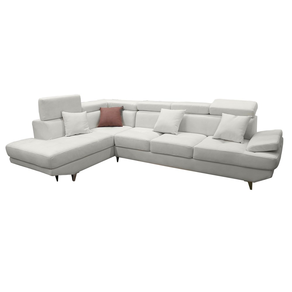 Divan këndor, majtas, strukturë druri, këmbë metalike, tapiceri tekstili, e bardhë, 300x200xH85-100 cm