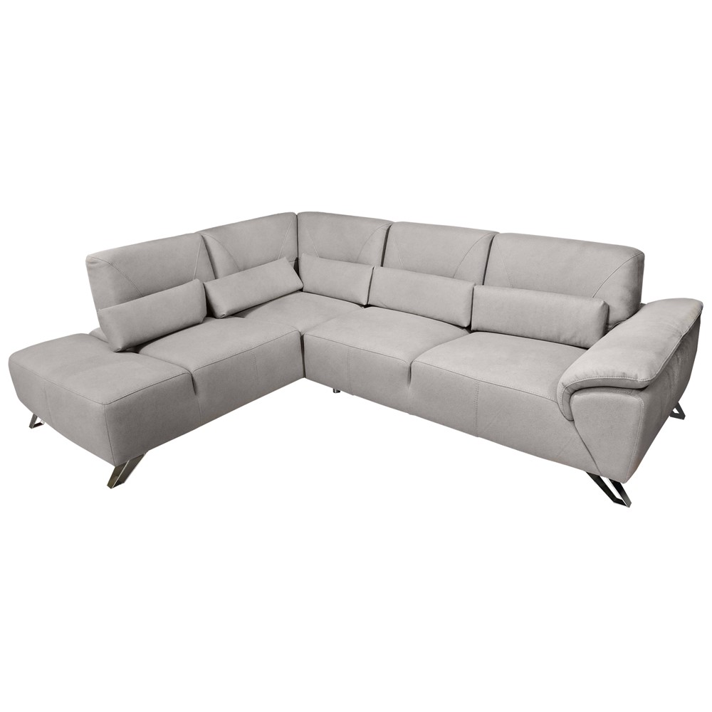 Divan këndor, majtas, strukturë druri, këmbë metalike, tapiceri tekstili, gri, 220x275xH85 cm