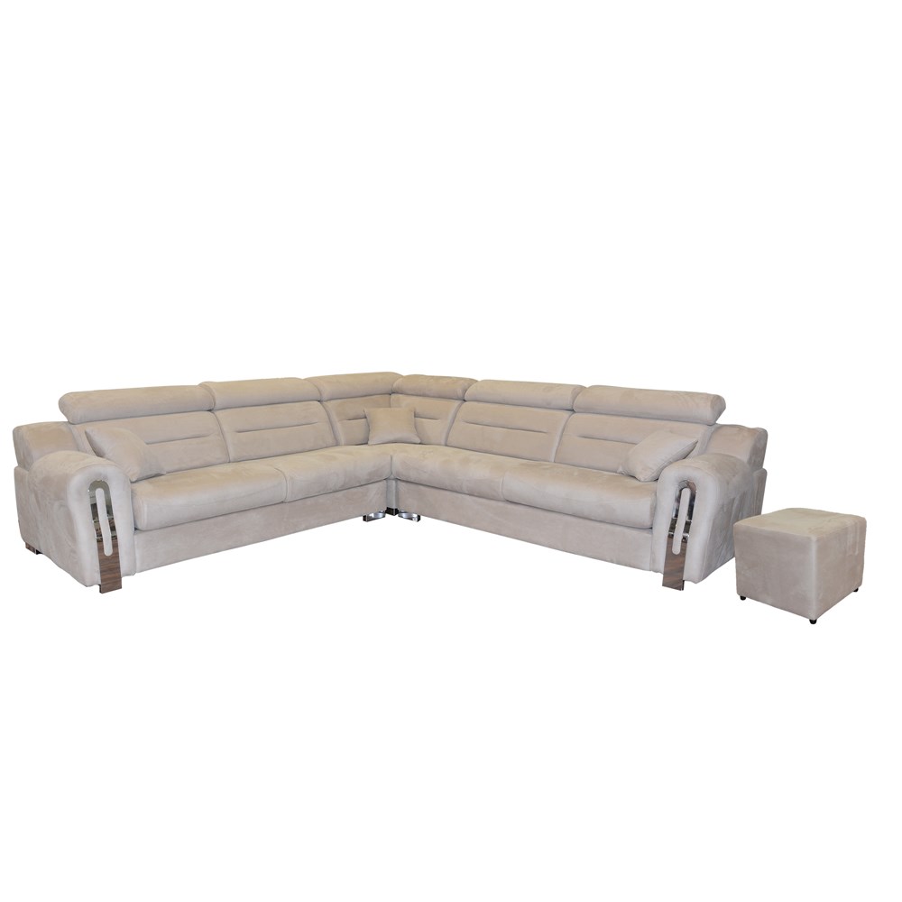 Divan këndor me pupë, strukturë druri, tapiceri tekstili, bezhë, Divani këndor: 300x300xH85 cm; Pupa: 50x50xH42 cm