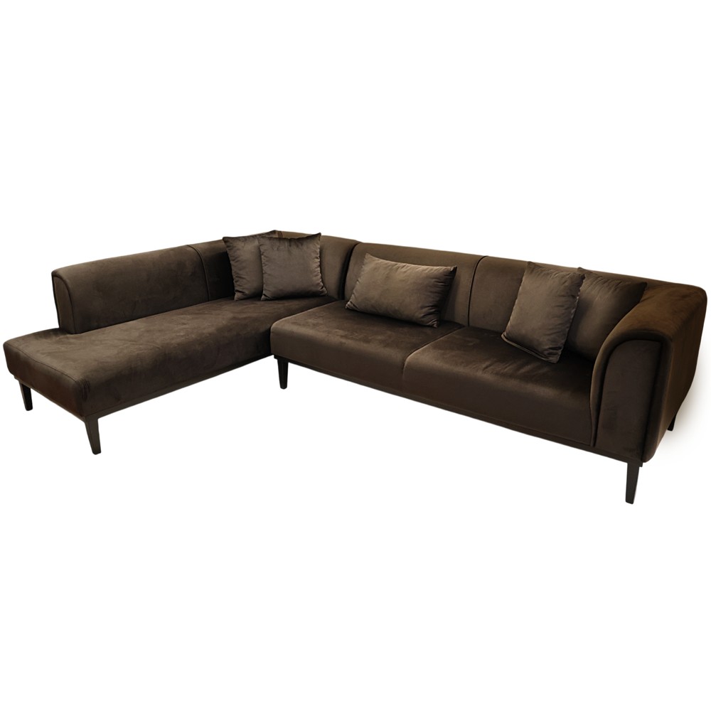 Divani këndor është një zgjedhje elegante për ata që kërkojnë një mobilje të përshtatshme për hapësirat e tyre të banimit, duke ofruar jo vetëm një pamje të bukur, por edhe komoditet dhe funksionalitet. Model djathtas, i cili do të thotë se këndi i divanit është i vendosur në anën e djathtë kur jeni përballë. Përmban një tapiceri tekstili, me ngjyrën kafe të errët. Kjo ngjyrë mund të kontribuojë në krijimin e një atmosfere të sofistikuar dhe të qetë, mund të përshtatet lëhtë me dekorin e shtëpisë.