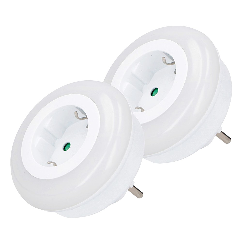2 cop dritë nate LED me sensor drite të integruar. Drita e natës LED është e pajisur me një prizë të përshtatshme për furnizim, në mënyrë që të mund të përdorni akoma spinën e përdorur për llambën. Dritat e natës për dhomat e fëmijëve. Ofron më shumë siguri në errësirë. Me sensor - ndizet automatikisht kur errësohet. Prizë e integruar 230 V me mbrojtje për fëmijët. Dritë e bardhë LED. E pajisur me 3 LED për kursim të energjisë dhe jetëgjatësi të gjatë. Jetëgjatësia 30,000 orë.