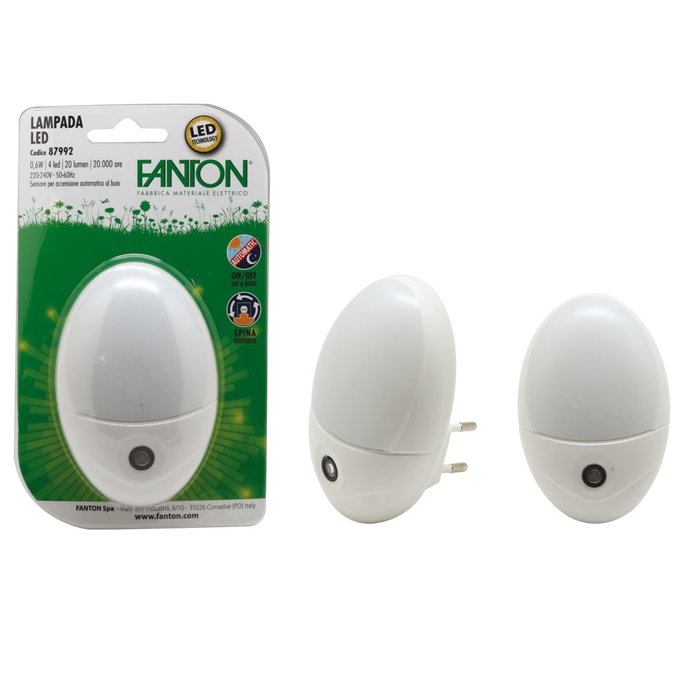 Dritë nate me sensor muzgu, e ndriçuar nga 4 LED - 20 Lumen. Izolimi i dyfishtë. Fikje automatike sipas dritës të ambjentit. Prizë rrotulluese 2P, 2.5 Amper