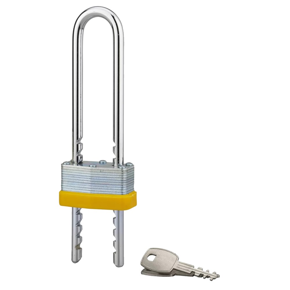 Laminated zinc plated steel body with PVC bumper. Steel shackle. Disk mechanism. 2 nickel plated steel keys.