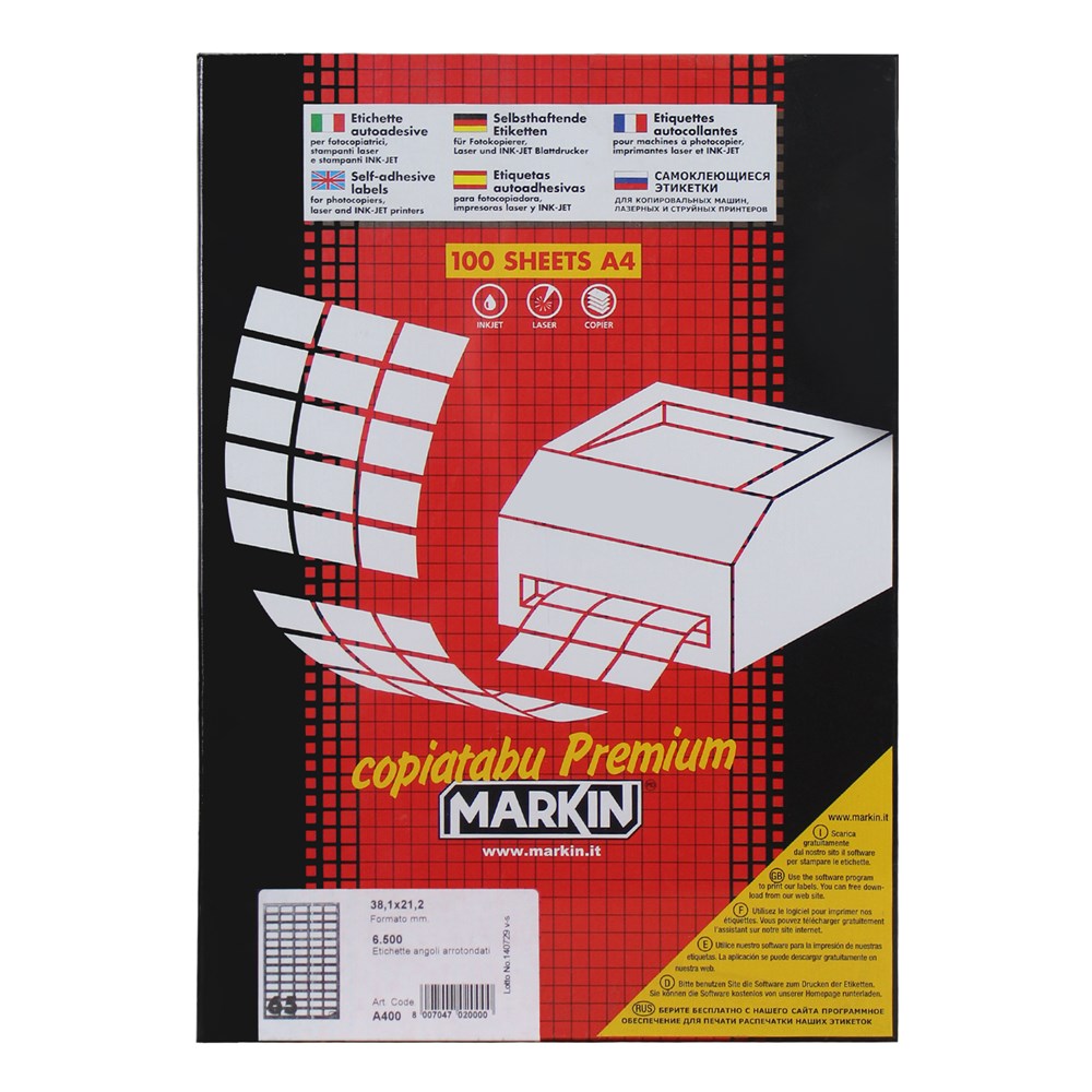 Etiketa ngjitëse 38x21.2 mm, pa diferencë. E pershtatshme për fotokopje, printer lazer etj. Format A4, 100 fletë për paketim, 65 etiketat për fletë me ngjitjes të përhershëm.