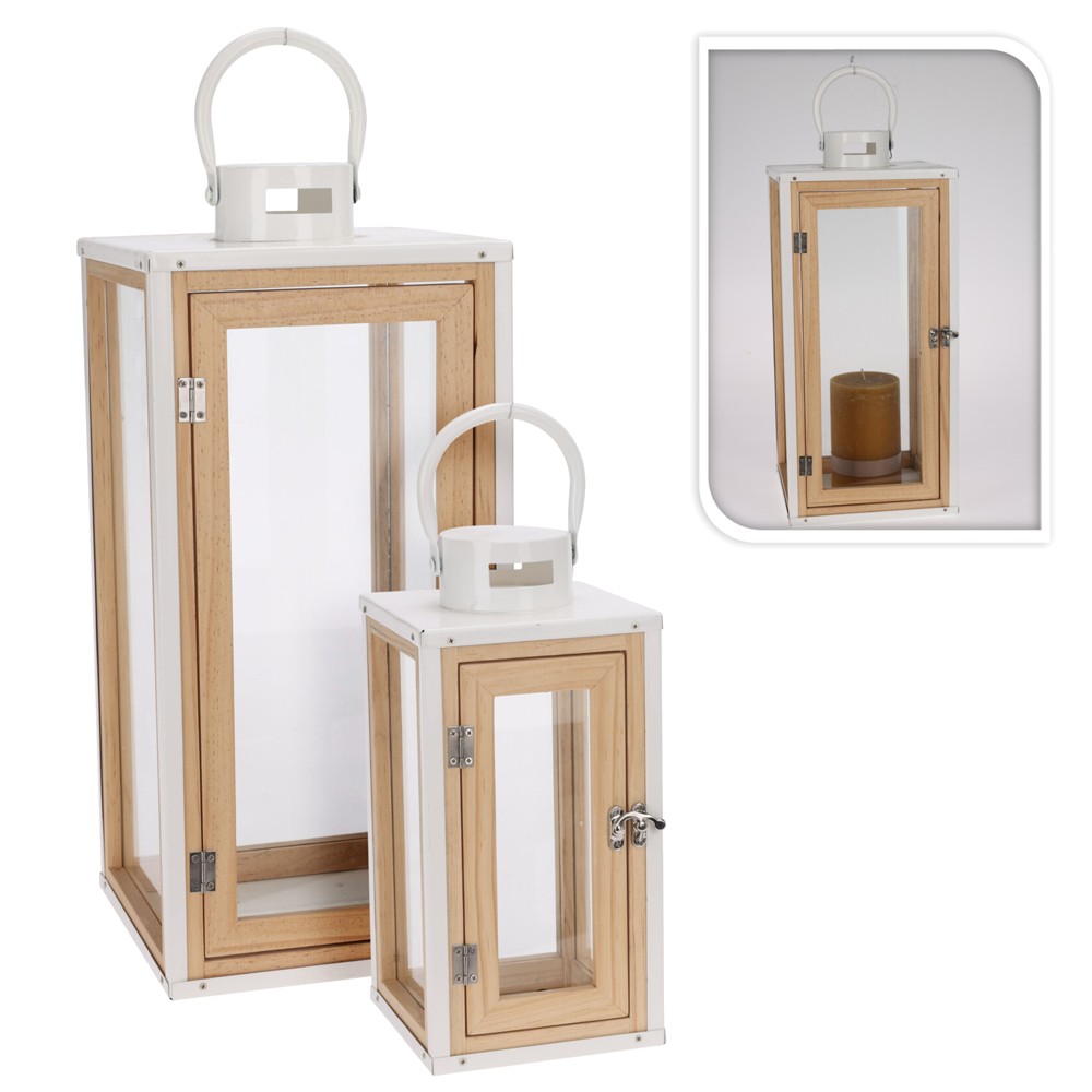 Fener dekorativ, 2 copë, xham/druri, e bardhë/natyrale, 14.5x14.5xH30.5 cm; 20x20xH45.5 cm