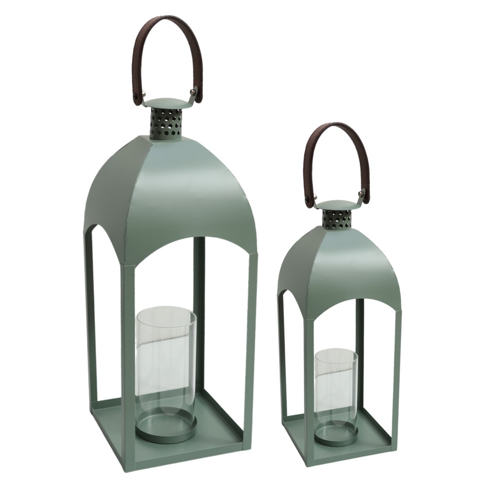 Fener dekorativ, set 2 copë, metalike/qelq, jeshile, 12x12xH30 cm; 16x16xH43 cm