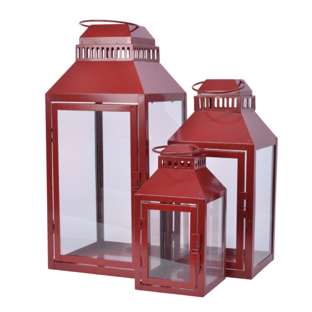 Fener dekorativ, set 3 copë, metalike, e kuqe, L:20x20xH45cm, M:16x16xH35cm, S:12x12xH24cm