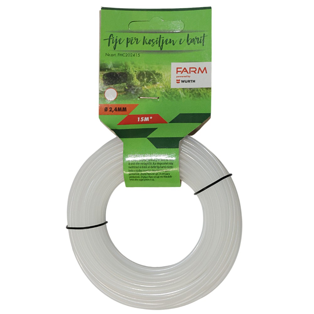 Fije najloni për prerëse bari universale, 15 m. Përdoret për të gjitha llojet e prerësve të barit. Ka një trashësi prej 2.4 mm ç'ka mundëson një prerje të shpejtë dhe efikase.