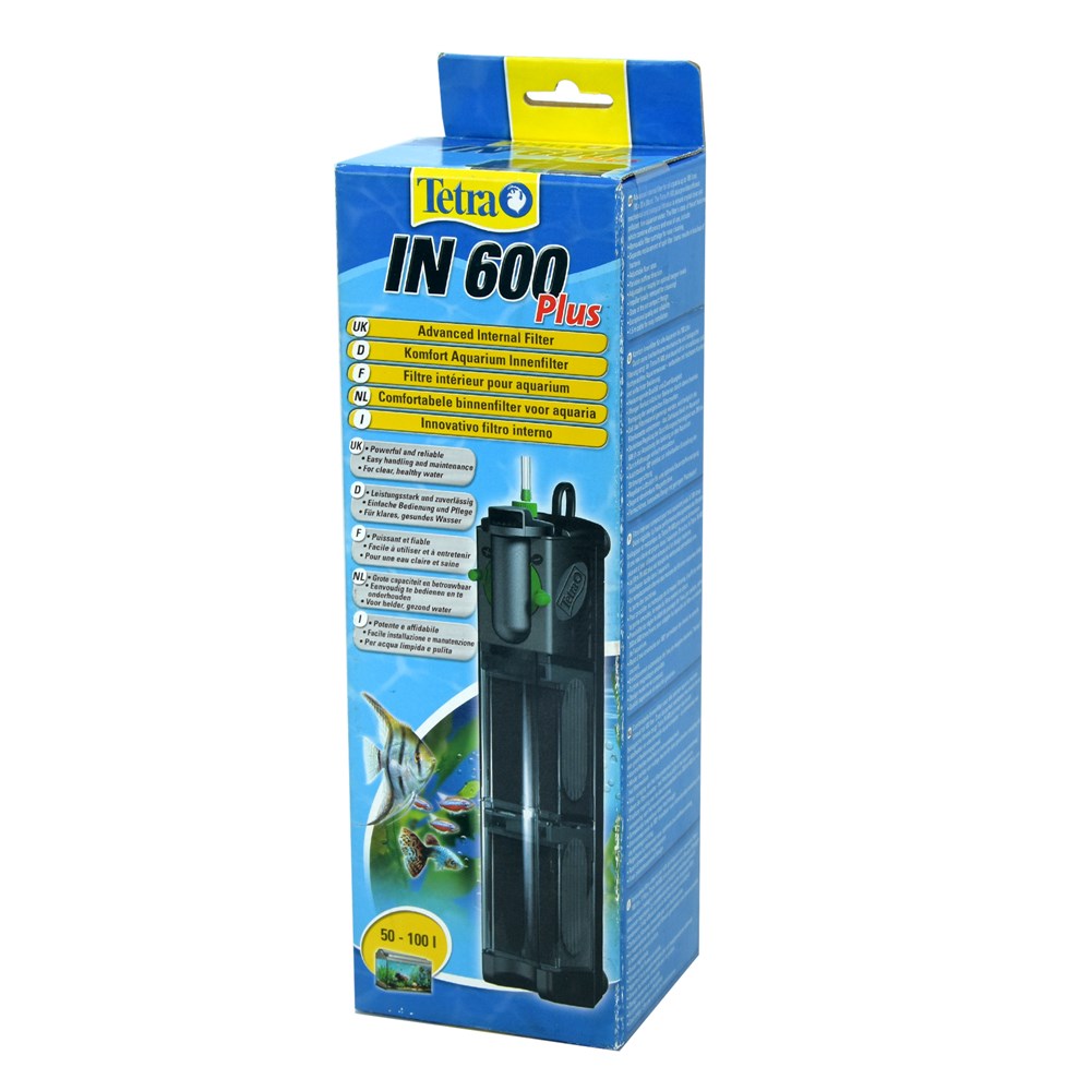 Tetra IN 600 plus është një filtër i dobishëm i brendshëm për të gjithë akuariumet deri në 100 litra. TetraTec IN 600 plus siguron filtrim efikas mekanik dhe biologjik për të siguruar ujë akuariumit kristal të pastër dhe pa ndotës. Përparesite: filtr i lëvizshëm për pastrim të lehtë, furnizimi i rregullueshëm i ajrit për nivelet optimale të oksigjenit, rregullimin e prurjes 300 - 600 l / orë, variacion për drejtimin e prurjes, cilësi dhe besueshmëri e jashtëzakonshme, konsumi i energjisë 230 V / 50 Hz, 8 W, për akuariumë: 50 deri në 100 L