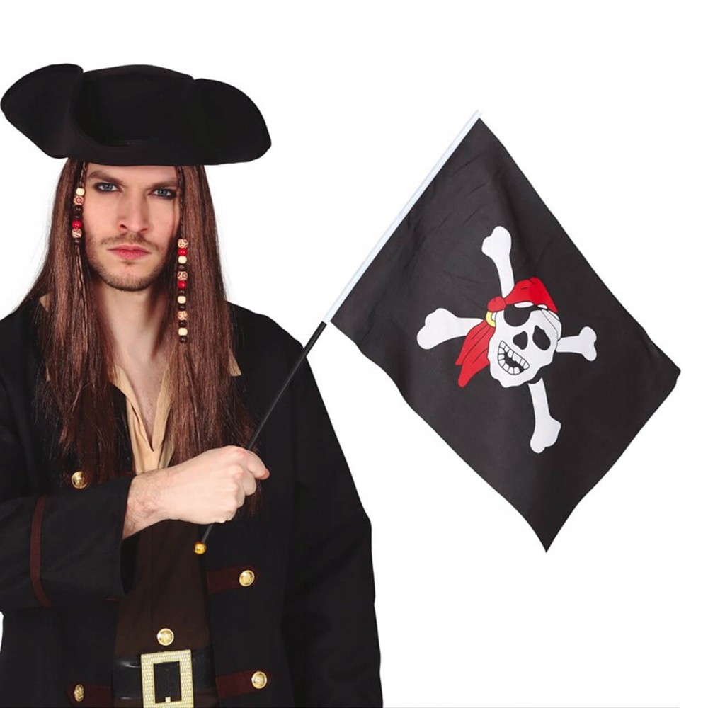 Flamur piratësh, prej materiali plastik dhe tekstil, me përmasa 42x30 cm, në ngjyrë të zezë, me stampim kafkë. Përdoret si aksesor për veshje të ndryshme Halloween-i apo karnavalesh.